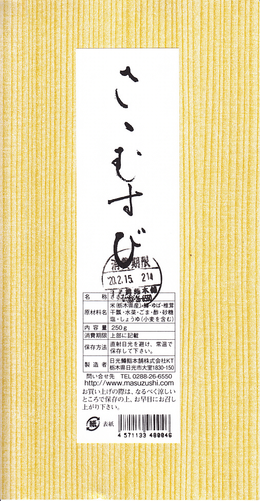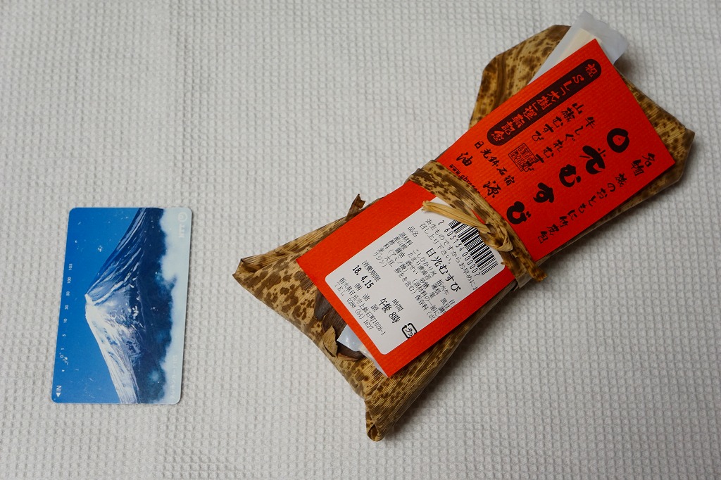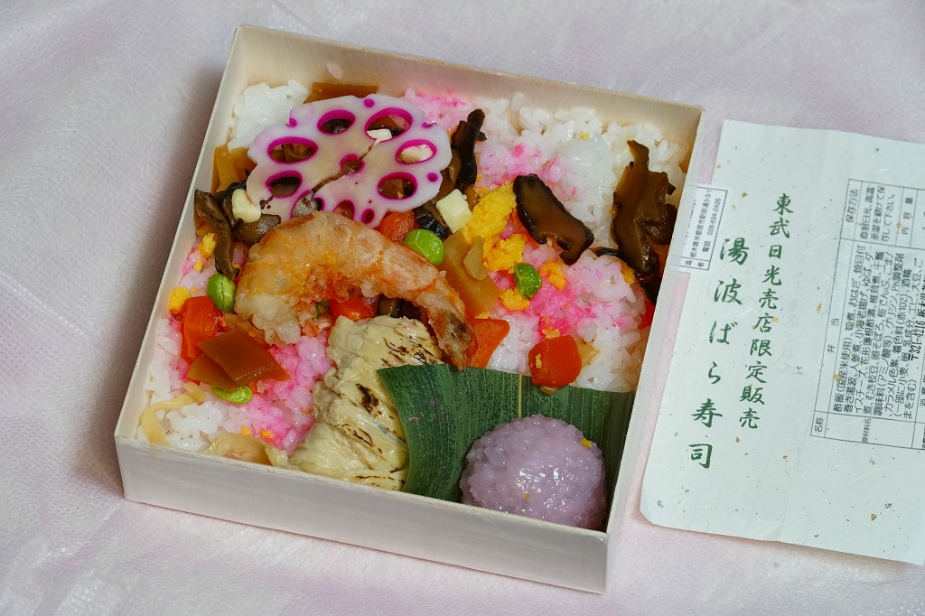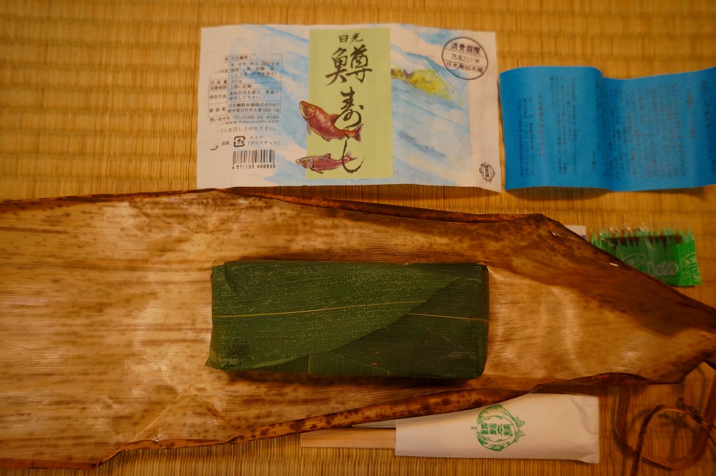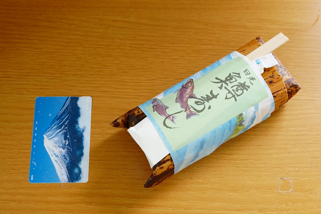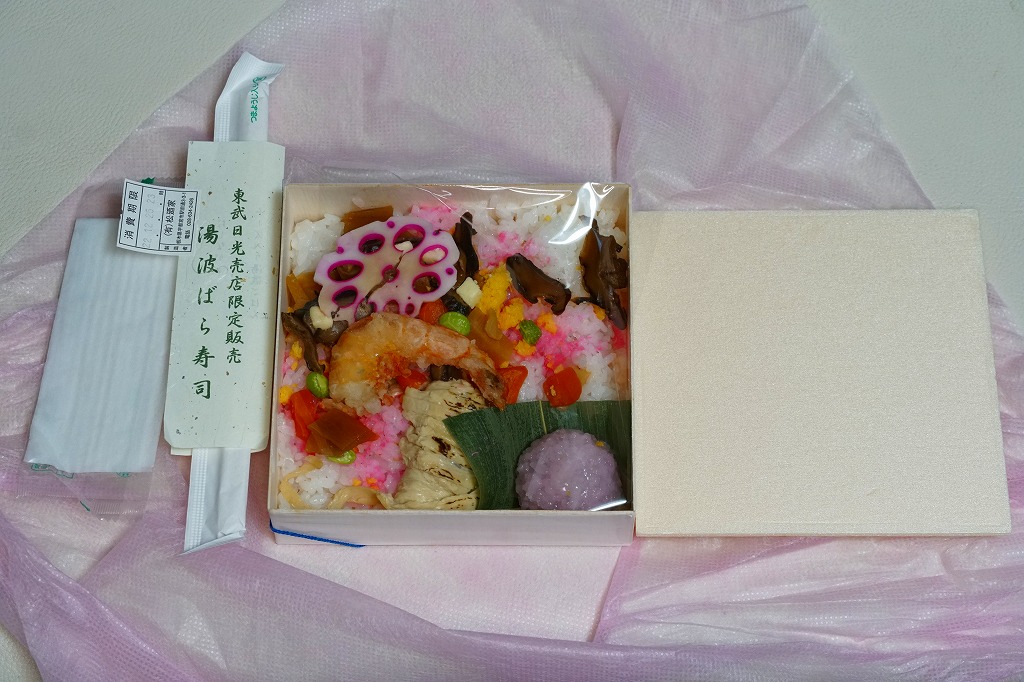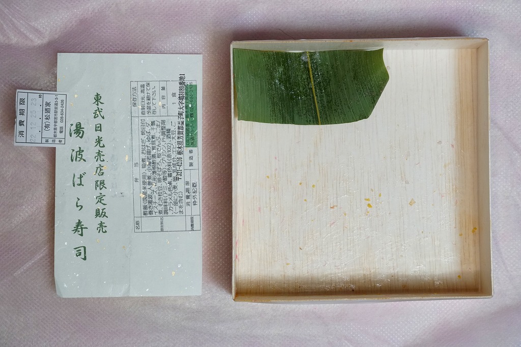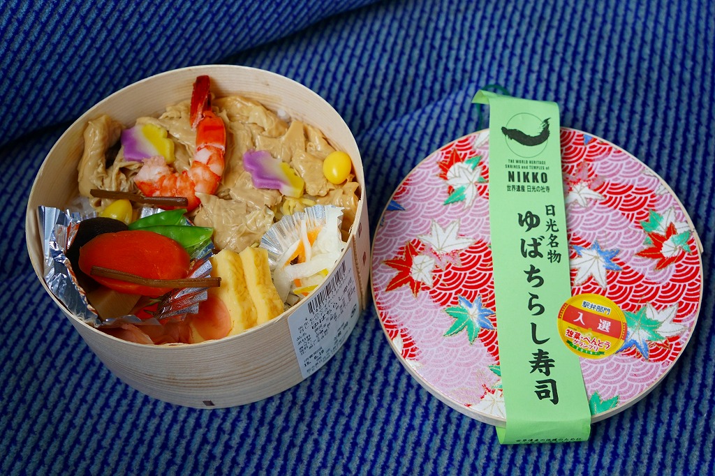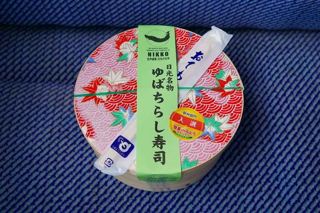 駅弁としては1992(平成4)年5月に、東武日光駅で発売した模様。ゆばを挟んだ直方体の酢飯に、中禅寺湖特産というヒメマスの身を寿司ネタ大にして貼り、笹の葉で目張りしてから竹の皮で包み、しおり、しょうゆ、おてふき、割りばし、ナイフを添えて掛紙で巻く。値段は高いが味はうまいの一言。価格は2002年時点で1,260円、2014年4月の消費税率改定から1,300円、2023年時点で1,500円。