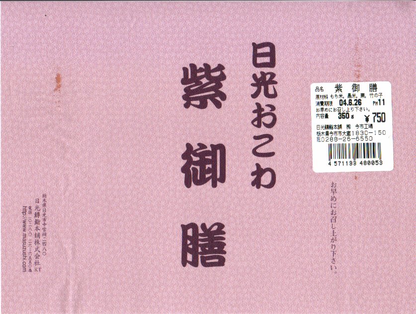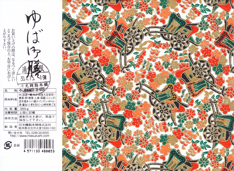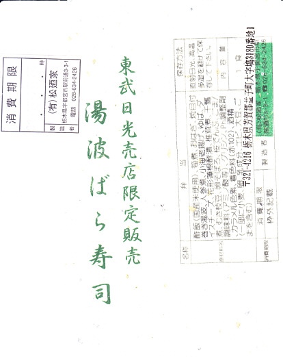 2011(平成23)年10月21日に購入した、東武日光駅弁の掛紙。上記の2019年のものとほぼ同じだが、内容量が一人前でなく「310g」であったり、製造者に製造所固有記号が付いていたり、消費期限の捺印の日付が平成表記だったりなどの差異はある。