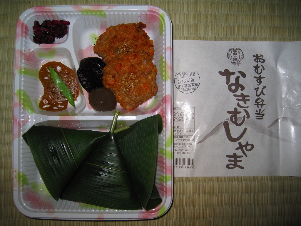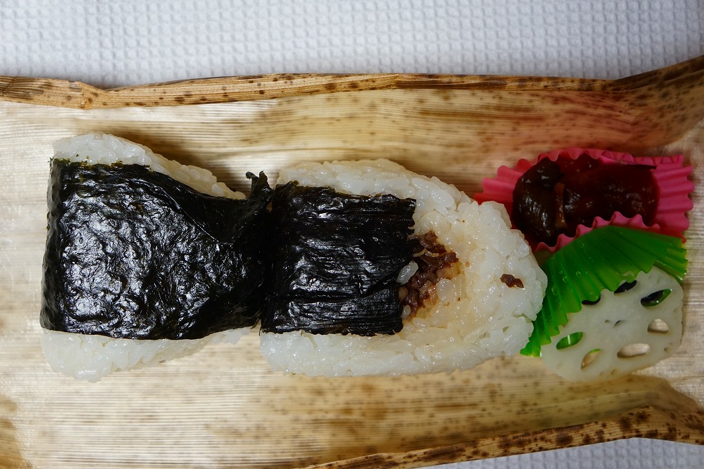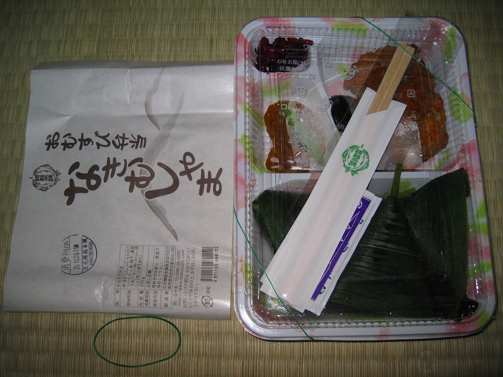 安物の惣菜弁当に使われていそうなプラ製の容器を使用、これに商品名と必要な情報を書いた薄い掛紙を巻いて、輪ゴムでしばる。中身は笹の葉にしっかり包まれた、マス、梅干、高菜のおにぎりが各1個と、魚ハンバーグ、こんにゃくとしいたけ、レンコンときぬさや、柴漬けが入る。
