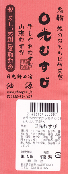 2017(平成29)年8月10日の東武鉄道のSL列車「SL大樹」のデビューとともに発売か。竹皮に小さく平たい牛しぐれ煮のおむすび2個と、れんこん、黒豆、たまり漬を包み、商品名と「祝SL「大樹」運転記念」と書いて食品表示ラベルを貼った朱色の掛紙を合わせる。これはもしかすると駅弁発祥宇都宮説、竹の皮に握り飯2個とたくあんを包んで売ったというものを、おおむね再現したものか。中身の見栄えは宇都宮駅のそんな再現駅弁を、だいぶ貧相にしたように見えた。2022年までの販売か。