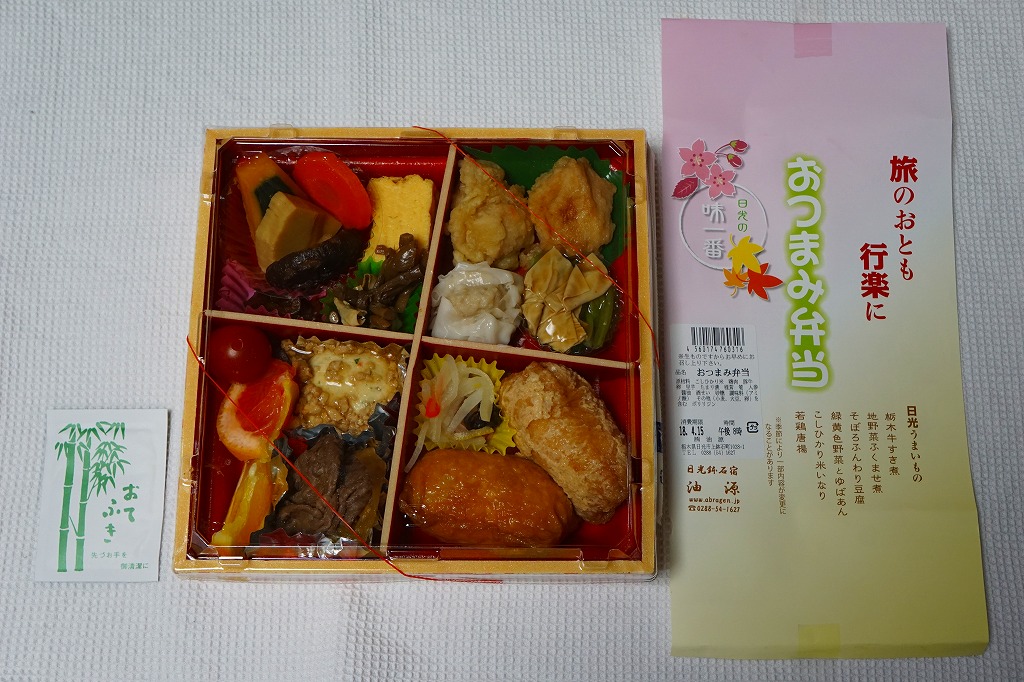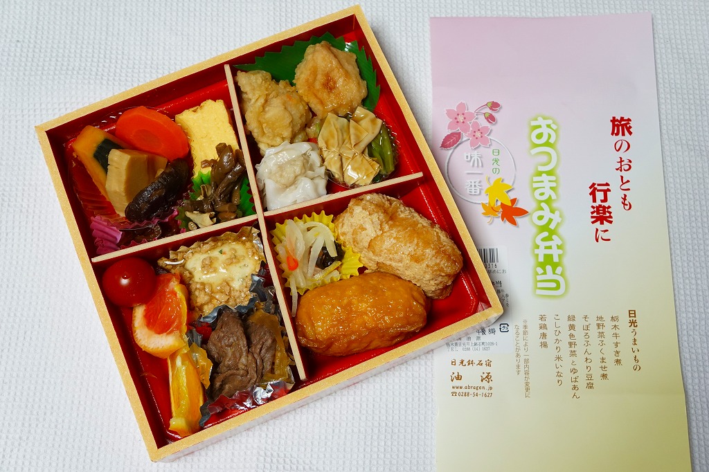 2013(平成25)年4月20日の発売か。松花堂の仕切りを少し曲げた4区画に、2種のおいなりさんと漬物、鶏唐揚2個と焼売と湯波あん、煮物と山菜と玉子焼、そぼろふんわり豆腐と牛肉煮とオレンジなどを詰める。名に違い、おつまみだけには特化していない、具だくさんのお弁当。価格は2018年の購入時で1,030円、2020年時点で1,050円。2022年までの販売か。