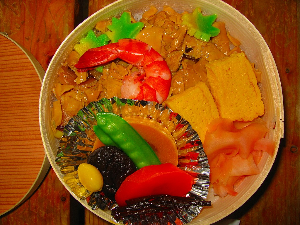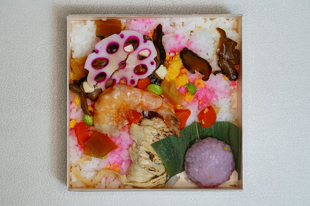 木を紙で補強した正方形のエコ容器に発泡材のふたをして、鷲のような風呂敷で包む。これに酢飯を詰め、ゆば巻きの炙りを据え、たけのこ、にんじん、小海老揚げ、ダイズチーズ、れんこん、しいたけ、かんぴょう、枝豆、卵そぼろ、桜でんぶ、ごまを散らし、おはぎを添える。ちらしずしであることを考えても、見栄えはもう一息に思えるが、これで日光と栃木を感じ取ってもらえただろうか。