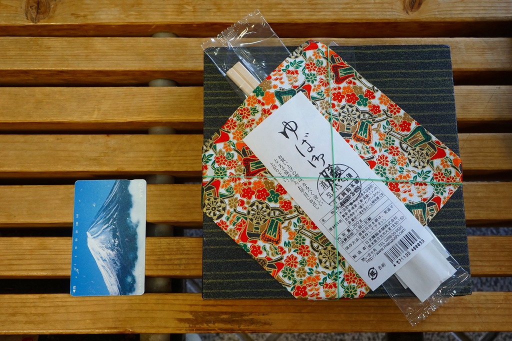 木目調で真っ黒な正方形の容器に、豪華絢爛な柄の和紙と駅弁の名前を記した短冊を載せて、ゴムで十字に留める。白いトレーに収まる中身は、マイタケ御飯にゆば巻、焼マス、椎茸とこんにゃく、玉子焼、昆布巻など。見栄えも中身も価格や内容以上の高級感を醸し出す。