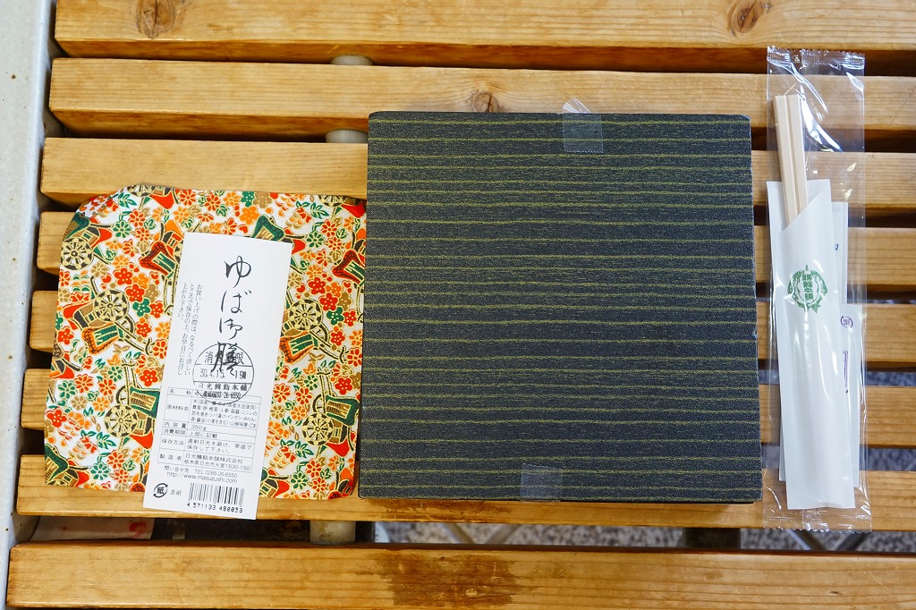 通常の駅弁では、焼き魚のサケをマスにするとグレードダウンとなるところが、こちらは調製元がマス寿司屋なので、サケに負けないか上回る厚みと香りがある。これは名前のとおりゆばの駅弁であり、中身としてはマイタケ弁当なのだけど、焼マスの存在感が最も高い感じがした。東武日光駅限定駅弁の中では最も高い評価を集めているらしい。価格は2004年時点で1,050円、2014年4月の消費税率改定で1,080円、2020年時点で1,150円、2022年時点で1,200円、2023年時点で1,250円、2024年時点で1,350円、2025年時点で1,400円。