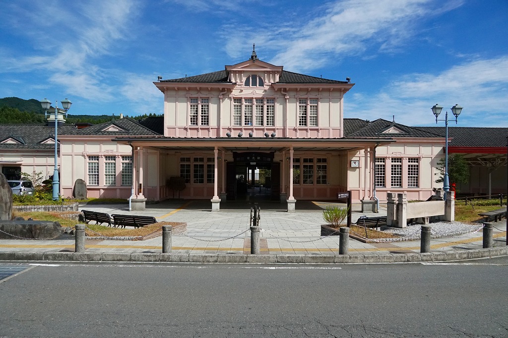 東武日光駅から徒歩3分。私鉄の日本鉄道が開業後ほどなく設けた日光の玄関口で、洋館の駅舎を皇族や大使や外国人も利用したが、東武鉄道の開業後約40年間の輸送競争に敗れ、1980年代以降は毎時1本ほどの普通電車が折り返す静かな駅。昭和時代に断続的に駅弁販売駅だった記録があるが、どのようなものかは知られない。1890(明治23)年8月1日開業、栃木県日光市相生町。