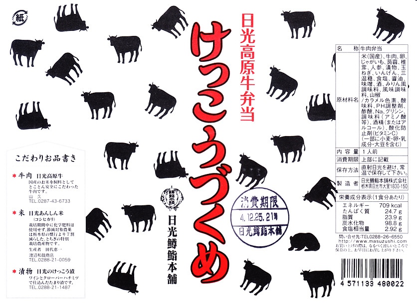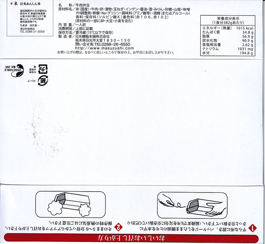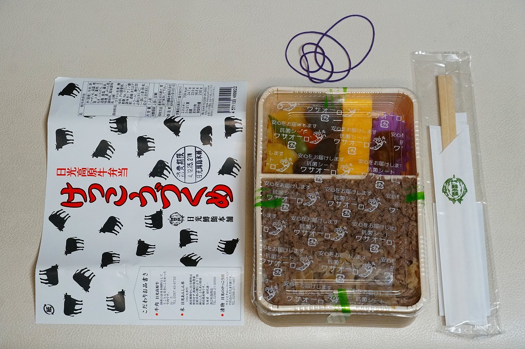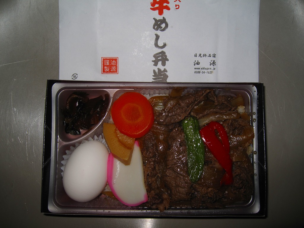 つまり米沢で人気の有名駅弁「牛肉どまん中」の模倣であるが、単なる模倣では良い味は出ないし、この手の駅弁を模倣できる駅弁屋はあまり見あたらない。牛肉は全国農業協同組合連合会栃木県本部(JA全農とちぎ)のブランド牛「日光高原牛」を使用、米は掛紙に生産者の名前を書いた栃木県今市市のコシヒカリを使用、漬物は日光名物のたまり漬のひとつ「けっこう漬」を使い、地場と品質をアピールする。関東地方ではナンバーワンの牛丼駅弁ではないかと思う。価格は2009年時点で1,050円、2014年4月の消費税率改定で1,080円、2020年時点で1,150円、2022年時点で1,250円、その年末までに1,300円、2025年時点で1,500円。