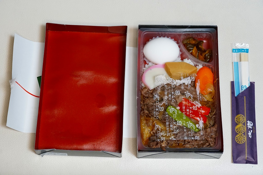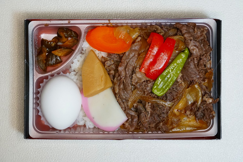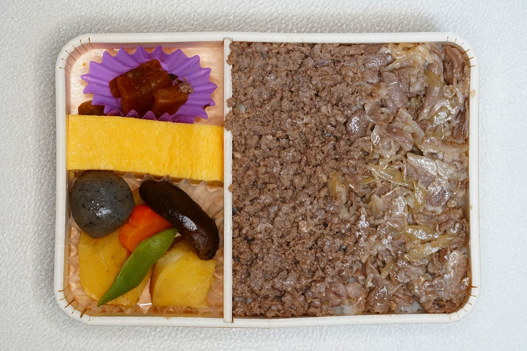 長方形の容器に透明なふたをして、割りばしを置いてから輪ゴムで留めて、商品名と牛のアイコンを印刷した掛紙を巻いてさらに輪ゴムで留める。中身は白御飯の上を牛そぼろと牛すきやき肉で覆い、玉子焼、ジャガイモやシイタケなどの煮物、漬物を添えるもの。