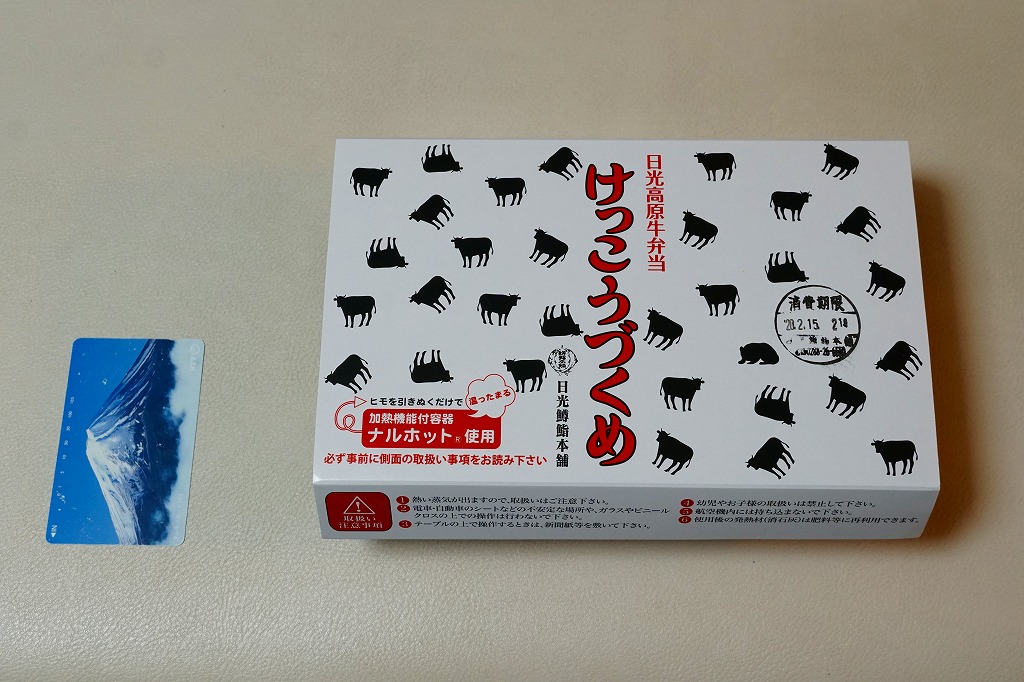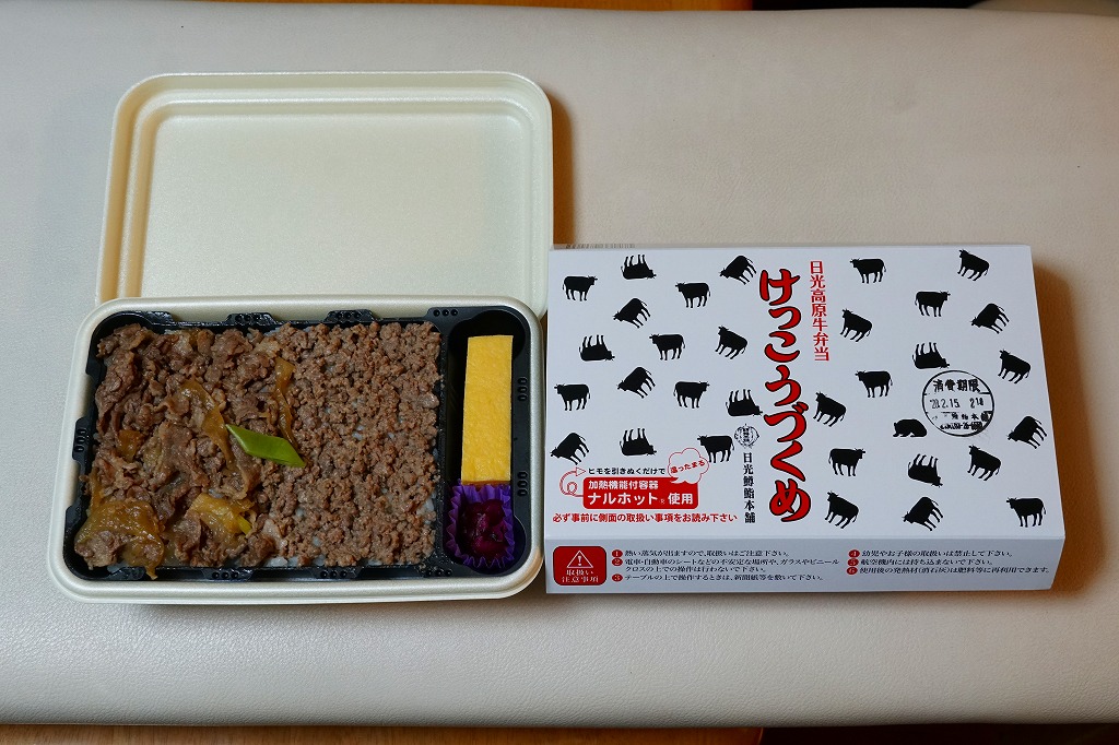 上記の駅弁「日光高原牛弁当けっこうづくめ」の、加熱機能付き容器版。スリーブの絵柄は通常版の掛紙と同じ。中身は通常版から煮物類が省略されており、牛そぼろと牛すき焼き肉で覆われた白御飯と、玉子焼と柴漬け。他の駅では通常版プラス200円が相場だと思う差額は、ここでは2020年当時で350円もあった。そのためか、加熱機能付き容器の牛肉駅弁では寂しく思うことが多い肉の分量が、ここでは確保されていた。この加熱機能付き容器版は2023年までの販売か。