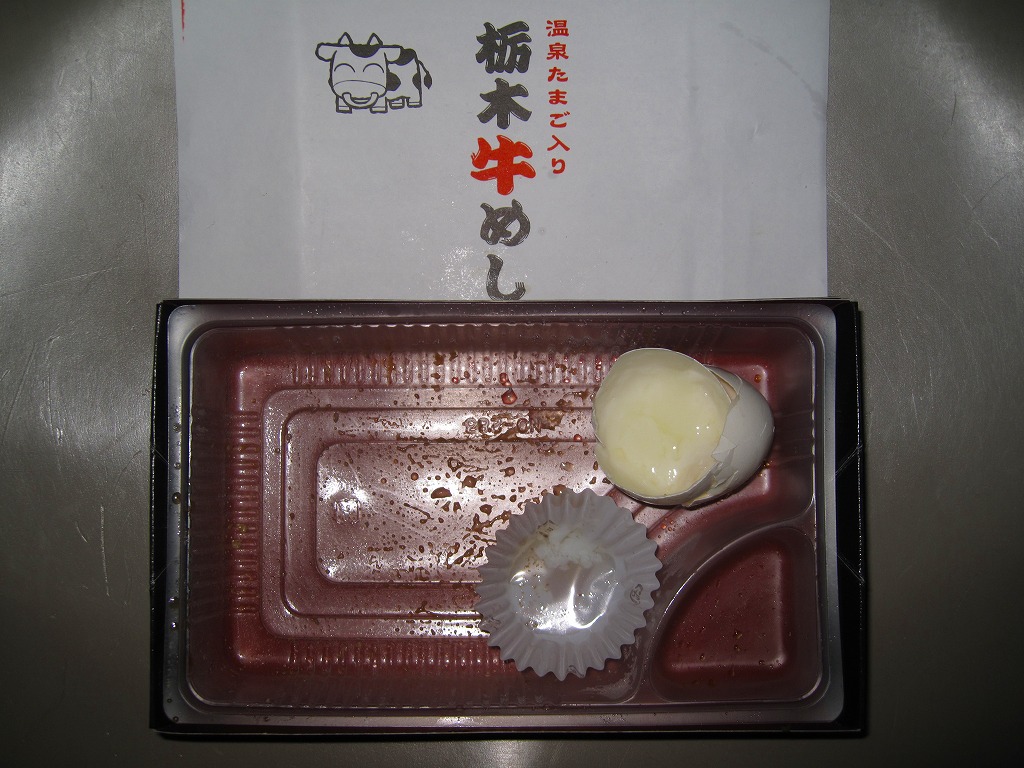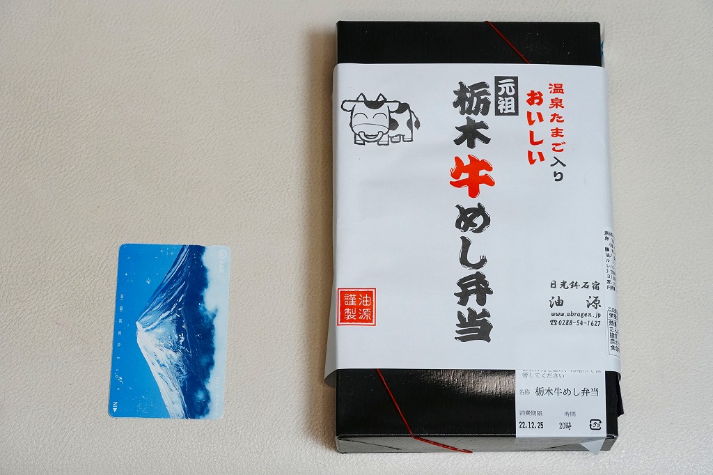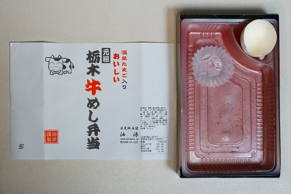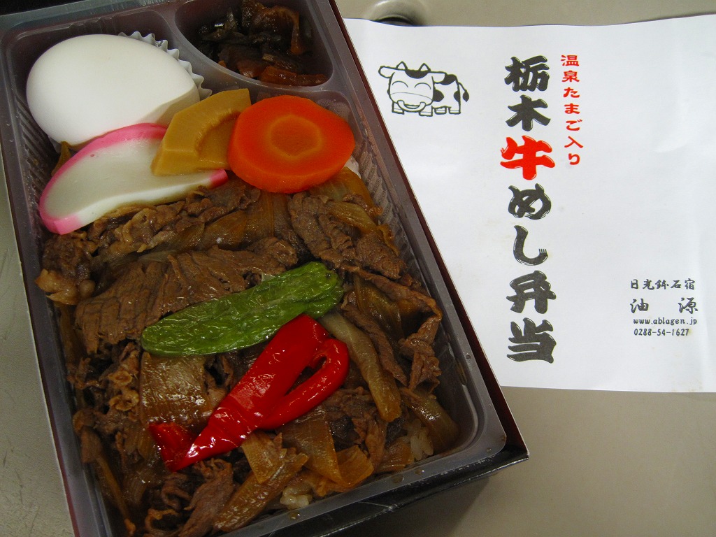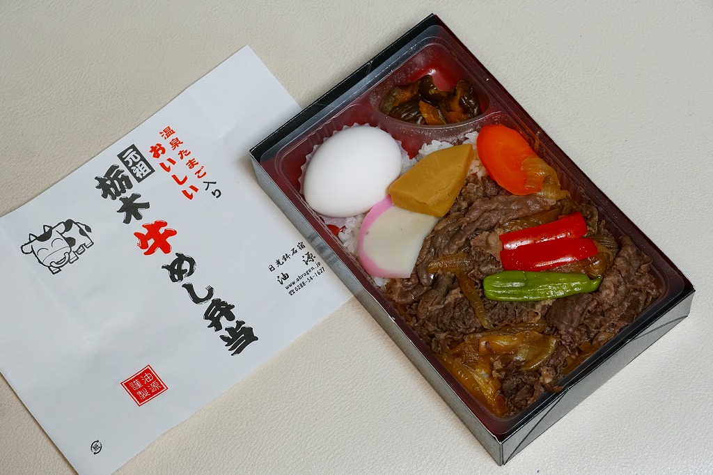 2007(平成19)年頃までに「栃木牛めし弁当」の名前で発売か。黒い木製風の長方形のボール紙製容器に、商品名を書いたシンプルな白い掛紙を巻く。白いプラ製トレーに入る中身は、コシヒカリの白御飯に、日光高原牛の赤身が真っ黒な牛焼肉を貼り、パプリカ、ししとう、ニンジン、タケノコ、かまぼこを貼り、温泉玉子とたまり漬を添えるもの。牛飯駅弁などとてもありふれた存在であるが、ここではシンプルながら他駅に似ない姿をしていた。価格は2010年時点で950円、2015年時点で「元祖栃木牛めし弁当」と名を少し変え1,000円、2022年時点で1,150円。