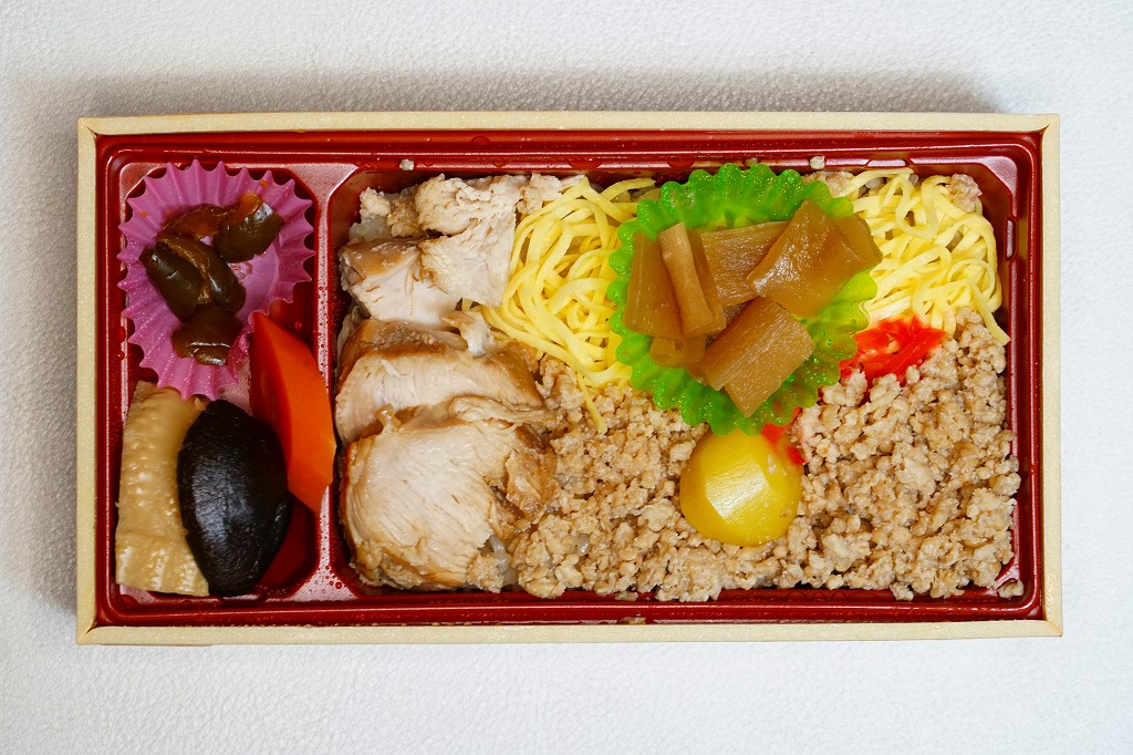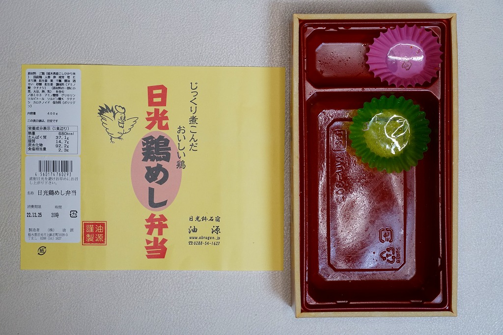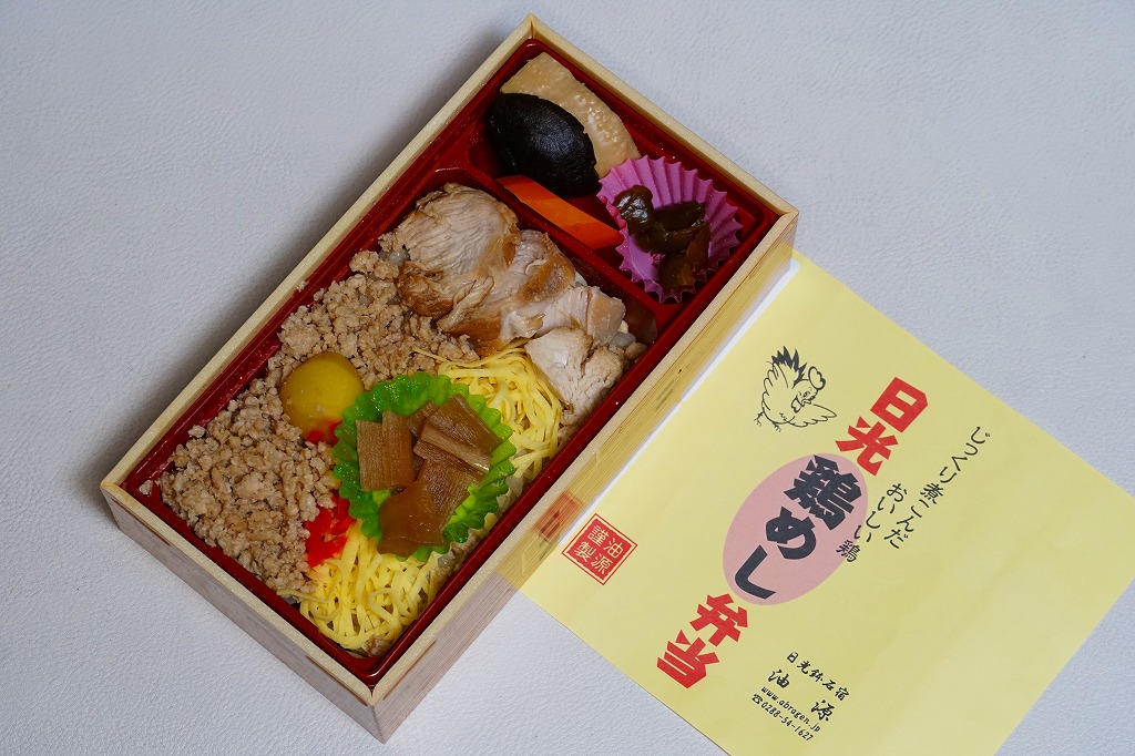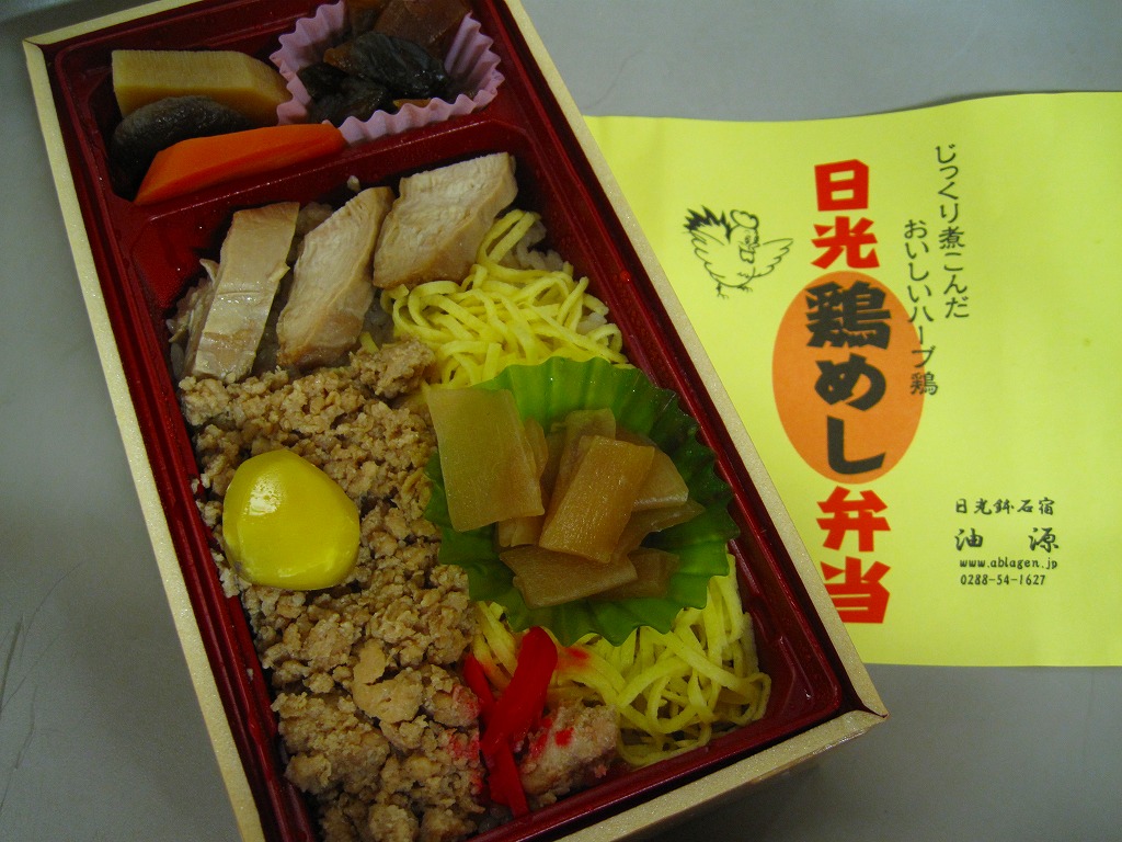 分量豊富でホクホク柔らかい鶏肉の味はくせになるし、全国各地に広がる鶏飯駅弁にこのような内容と風味は思い当たらない。ネット上のブログにはおいしかった報告がいくつも見付かる、日光の地になければ主役を張れそうな、B級グルメの面構えをした高品質な創作弁当。見本写真によれば、本来は具が鶏ほぐし身を埋め隠すレイアウトである模様。価格は2009年の購入時で850円、2014年4月の消費税率改定で880円、2020年時点で950円、2021年時点で920円、2022年時点で960円、2023年時点で1,000円、2024年時点で1,080円、2025年時点で1,150円。