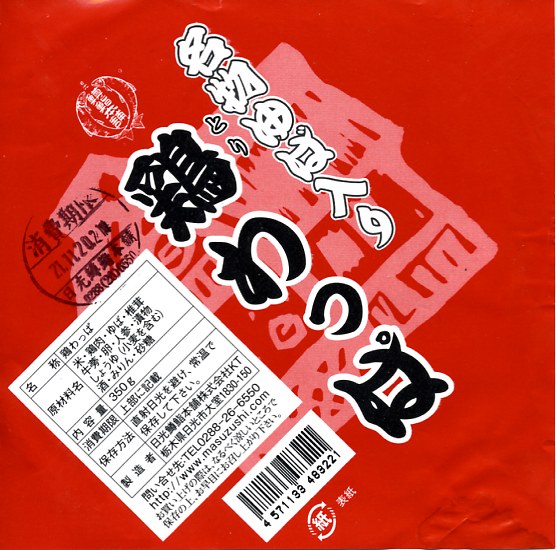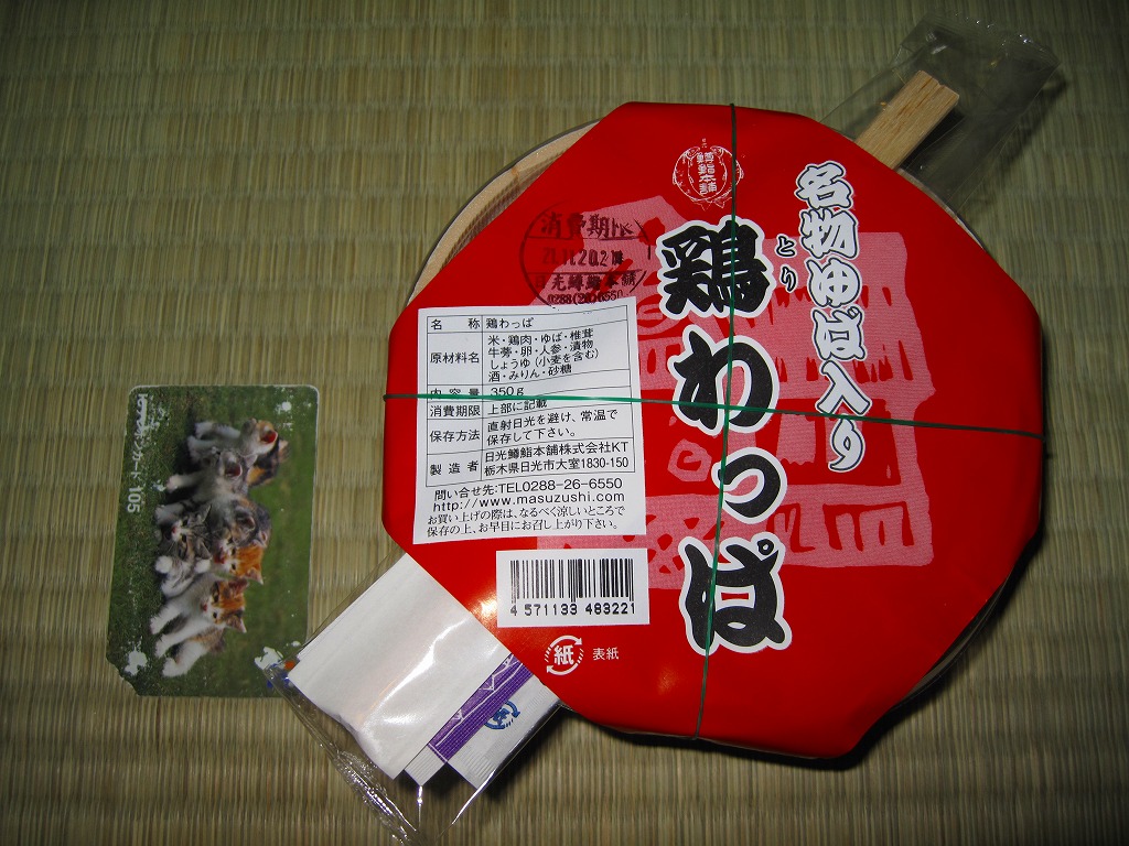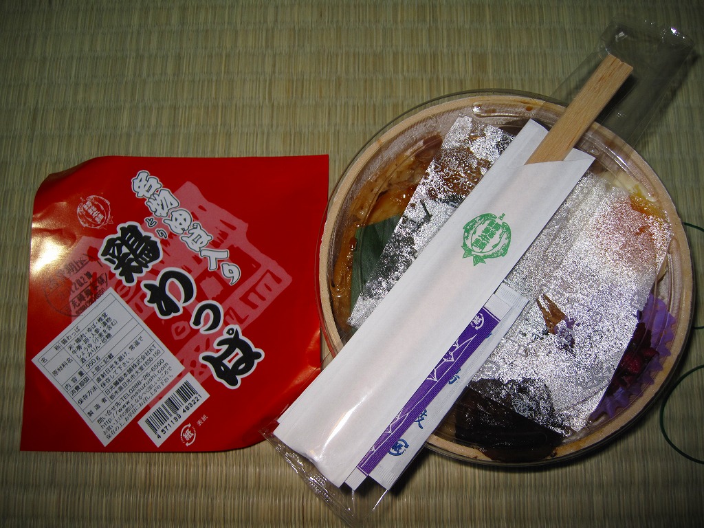 2007(平成19)年の秋頃までに発売か。2005(平成17)年の秋に発売した「軍鶏わっぱ」のリニューアル品だそうな。円形の容器に透明なふたをして、割りばしを置いて赤い掛紙をかけて、輪ゴムで十字にしばる。中身はおそらく鶏ガラスープで炊いた茶飯の上に、蒸し鶏ほぐしとゆばを敷き詰めて、煮玉子、手羽先、こんにゃく、ごぼう、シイタケ、クリ、柴漬けなどを載せるもの。