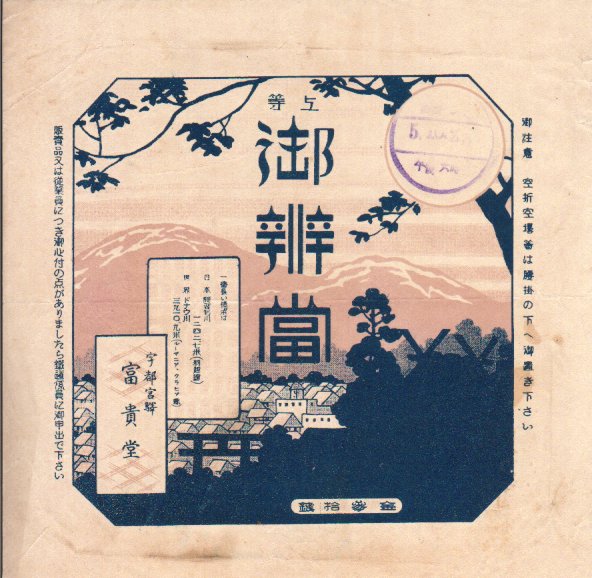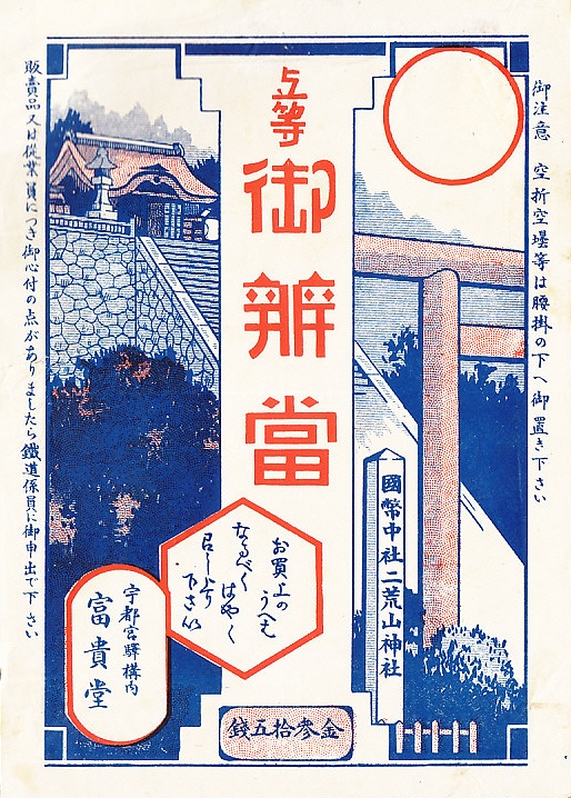 おそらく1920年代、大正時代末期か昭和時代初期のものと思われる、昔の宇都宮駅弁の掛紙。今も宇都宮市街のど真ん中に社を置く、宇都宮二荒山神社(うつのみやふたあらやまじんじゃ)を描く。