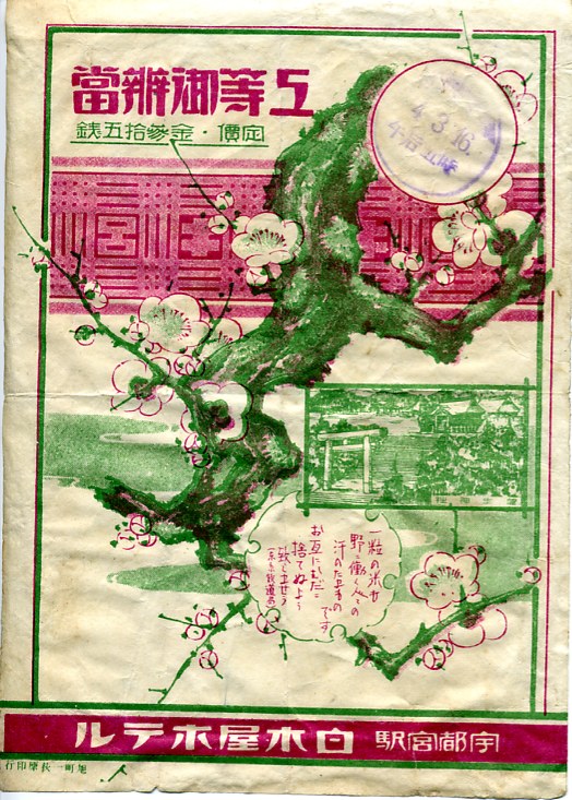 1929(昭和4)年3月16日17時の調製と思われる、昔の宇都宮駅弁の掛紙。桜花か梅花と神社に加えて、「一粒の米が野に働く人々の汗のたまものです。…」と、現代にも通じる東京鐵道局の標語が記される。