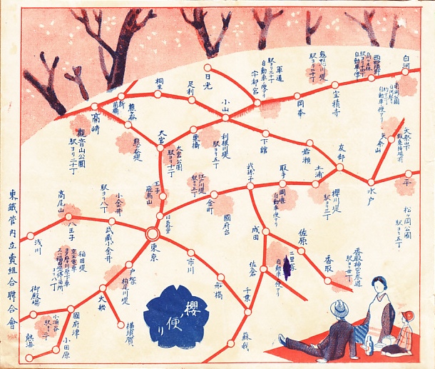 1932(昭和7)年3月11日9時の調製と思われる、昔の宇都宮駅弁の掛紙。おかずの掛紙は、下記の1930(昭和5)年の「上等御辨當」と同じ。御飯の掛紙は鉄道省の東京鉄道局管内の各社で共通のものと思われる、桜の便りとして管内各地の桜の名所と簡略の路線図を描く。