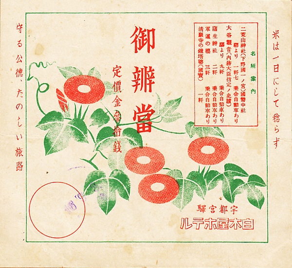1941(昭和16)年9月3日の調製と思われる、昔の宇都宮駅弁の掛紙。朝顔が爽やかな絵柄に見える。米は一日にして稔らず、守る公徳たのしい旅路、という程度の呼び掛けでは、ここではまだ戦時を感じにくいと思う。