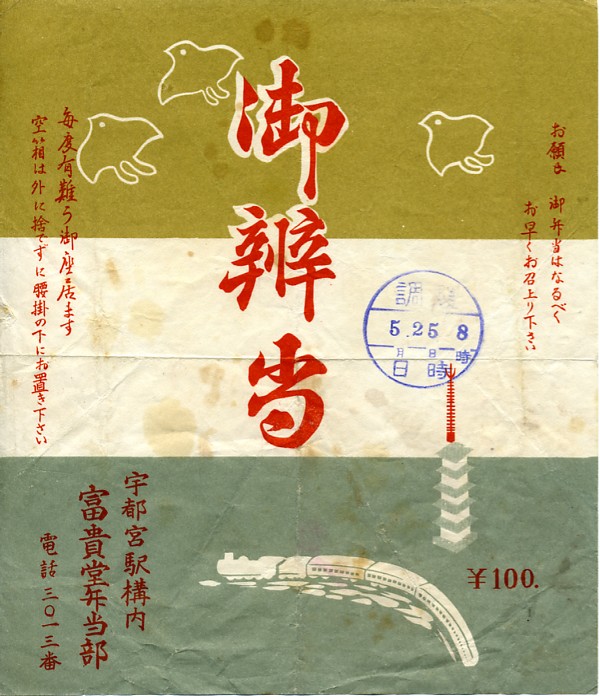 1950年代の、5月25日8時の調製と思われる、昔の宇都宮駅弁の掛紙。五重塔が宇都宮近辺にあったかどうか、絵柄に特段の意味はないだろう。当時の苫小牧駅弁の掛紙にかなり似ていると思う。