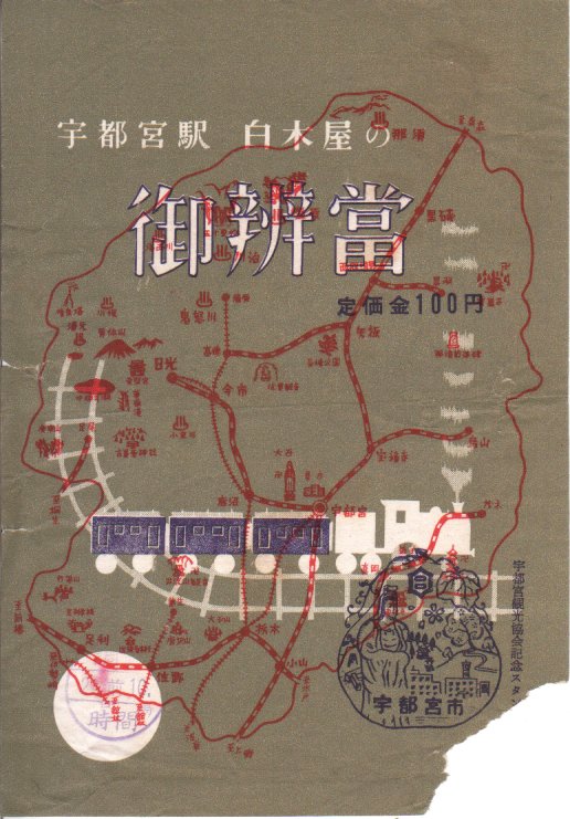 昭和30年代のものと思われる、昔の宇都宮駅弁の掛紙。栃木県内の鉄道路線図が描かれ、これに1959(昭和34)年廃止の東武矢板線高徳・矢板間があることから、それ以前の調製と思われる。長らく日本最古の駅弁屋とされた調製元は、現在は駅弁から撤退している。