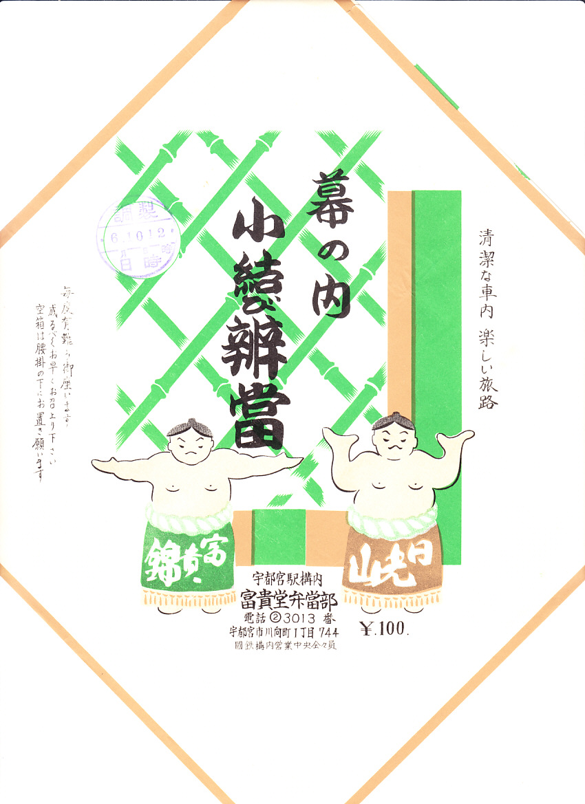 1963(昭和38)年6月10日12時の調製と思われる、昔の宇都宮駅弁の掛紙。日光山と富貴錦のしこ名を持つとみられる、2人の力士が描かれるが、実在やモデルの相撲取りがいるのではなく、近隣の名所と調製元の名前を取ったのだろう。中身は普通の並等幕の内駅弁と思われる。