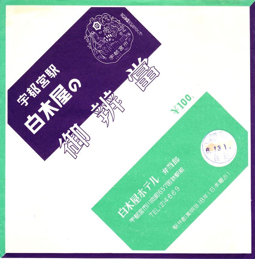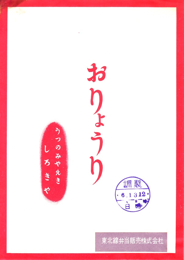 1963(昭和38)年6月13日12時の調製と思われる、昔の宇都宮駅弁の掛紙。これではまるで駅弁掛紙には見えなくても、宇都宮駅の駅弁屋であるしろきや(白木屋)と東北線弁当販売の連名ならば、宇都宮駅か東北本線の車内販売向けの掛紙だろう。