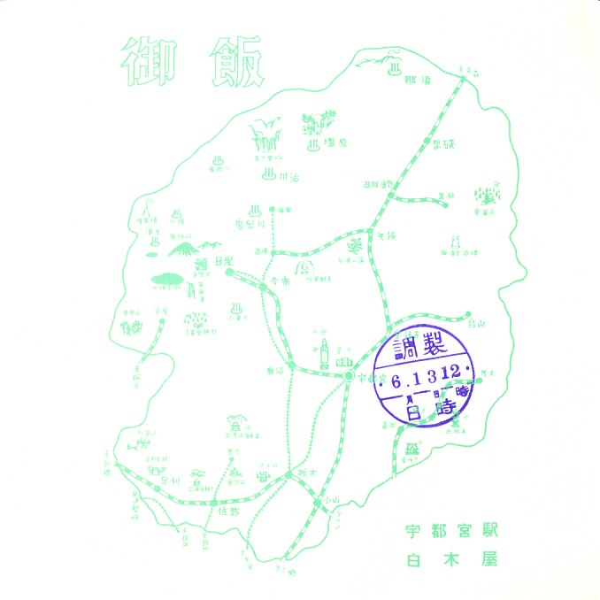 1963(昭和38)年6月13日12時の調製と思われる、昔の宇都宮駅弁の掛紙。上記の掛紙と同じ日付で同じ絵柄で同じ価格なのに、大きさも縦横比も異なる別の版であるのは不思議。栃木県の地図でできた御飯の掛紙もある。
