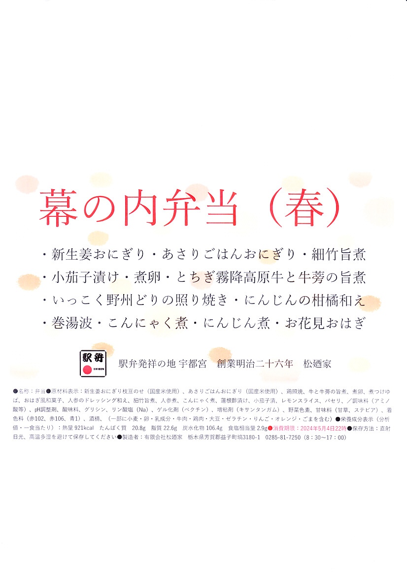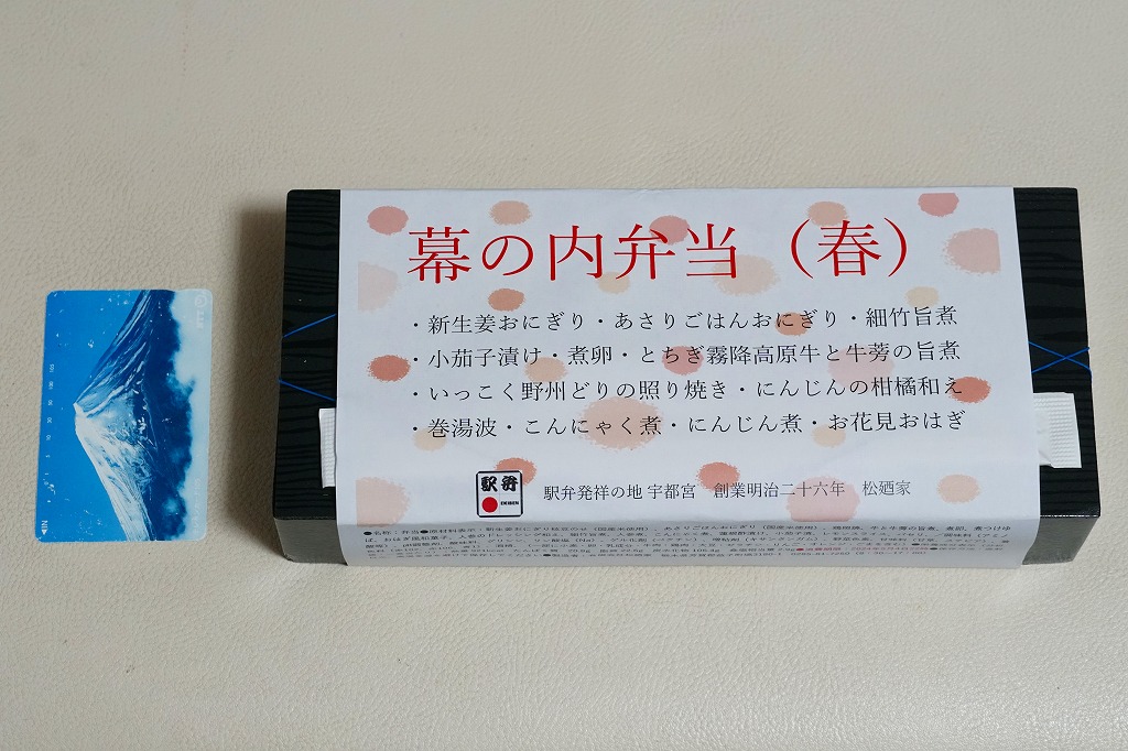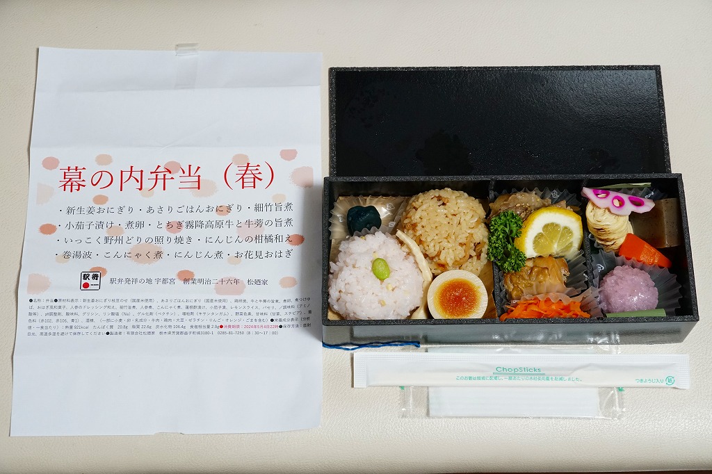 宇都宮駅弁の幕の内弁当の、2024年時点での姿なのかどうか。商品名とおしながきと食品表示を記した文字だらけの掛け紙に包まれた真っ黒なプラ容器の、左側に新生姜おにぎり、あさりごはんおにぎり、細竹旨煮、小茄子漬け、煮卵を、右側にとちぎ霧降高原牛と牛蒡の旨煮、いっこく野州どりの照り焼き、にんじんの柑橘和え、巻湯波、こんにゃく煮、にんじん煮、お花見おはぎを詰める。これは幕の内弁当なのだろうか。「大人の休日倶楽部駅弁発祥の地より汽車辨當」と同じような創作にみえる。値段は宇都宮駅弁にしては高額になった。