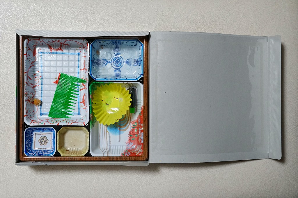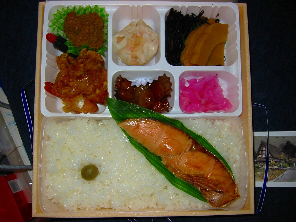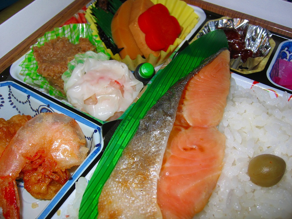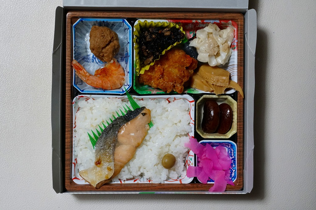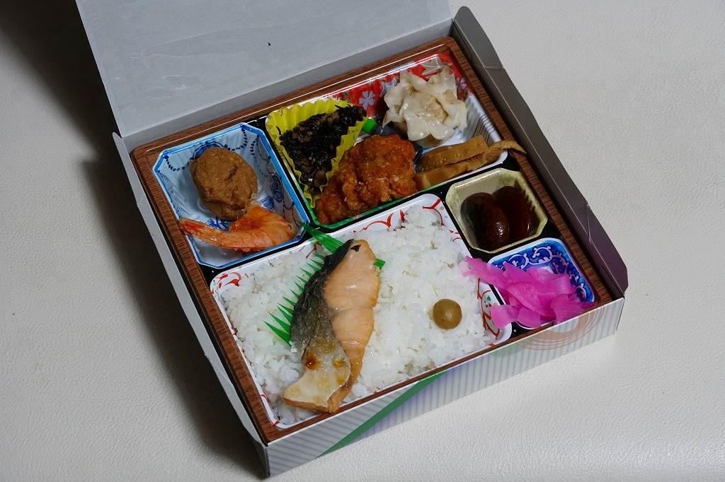 旅館の食事で見るような器の絵柄を印刷した、これも市販品のトレーの中に収まる中身は、マスの塩焼きを載せた日の丸御飯、海老からあげ、つくね寄せ、鶏唐揚、海鮮しゅうまい、ひじき煮、タケノコ煮、煮豆、大根桜漬。見た目に加えて内容や風味も野暮ったい、あるいは小さな弁当店が手作りしたような、古めかしい幕の内駅弁あるいは惣菜弁当。