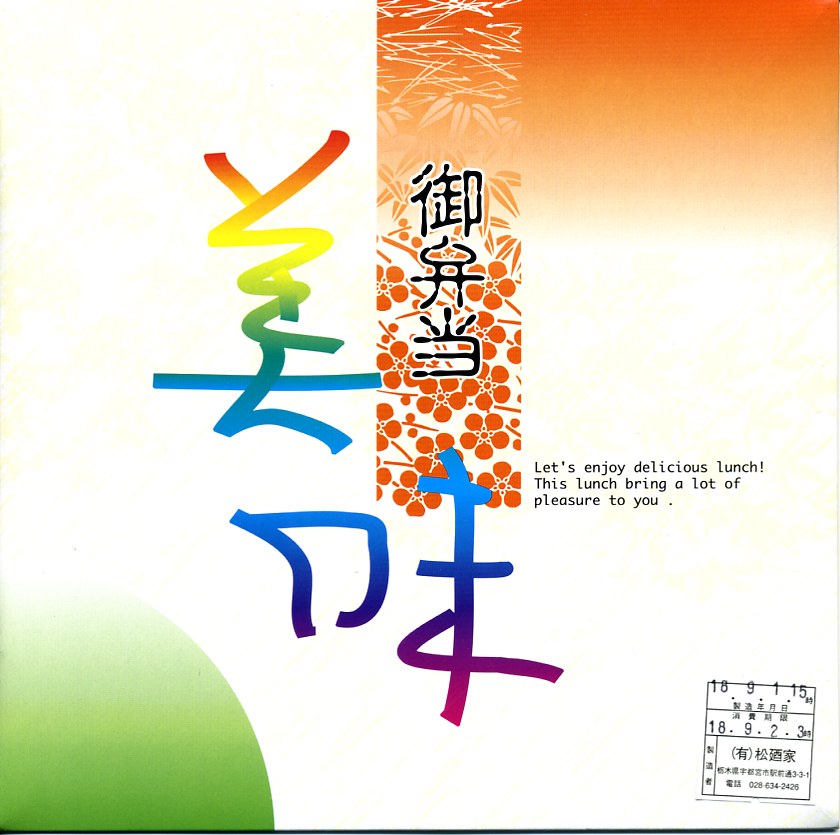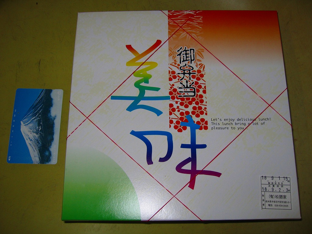 2006(平成18)年9月1日に購入した、宇都宮駅弁のふた。「御弁当美味」と書いてあるが、これは市販の市販の仕出し弁当箱の名前であり、駅弁の名前でない。下記の2003年のものと同じ駅弁なので、「特製幕の内」と推定。中身は上記の2022年のものと、トレーごと同じ。価格も変わらない。