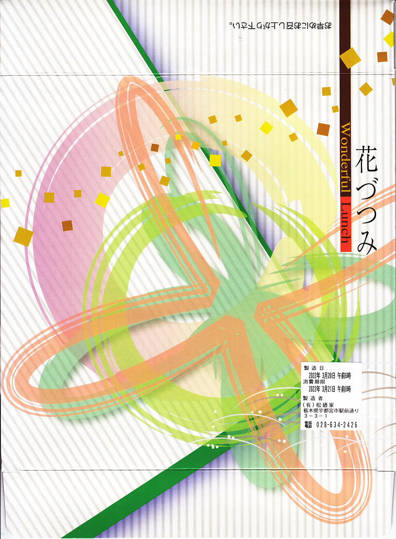 宇都宮駅弁の幕の内弁当。かつてここでは各社が幕の内駅弁を競ったが、今では松廼家のみが残るため、幕の内弁当もこれ1種。他に上等か特製の幕の内弁当「ふるさと幕の内」(1,000円)が存在することになっているが、その姿を見たことはない。ボール紙箱に記された商品名「花づつみ」は、市販の仕出し弁当箱の名前であり、駅弁の名前でない。駅弁の名前はどこにも書かれておらず、ここでは売店や市販の時刻表での表現どおり「幕の内弁当」とする。単に「幕の内」と書かれることもある。