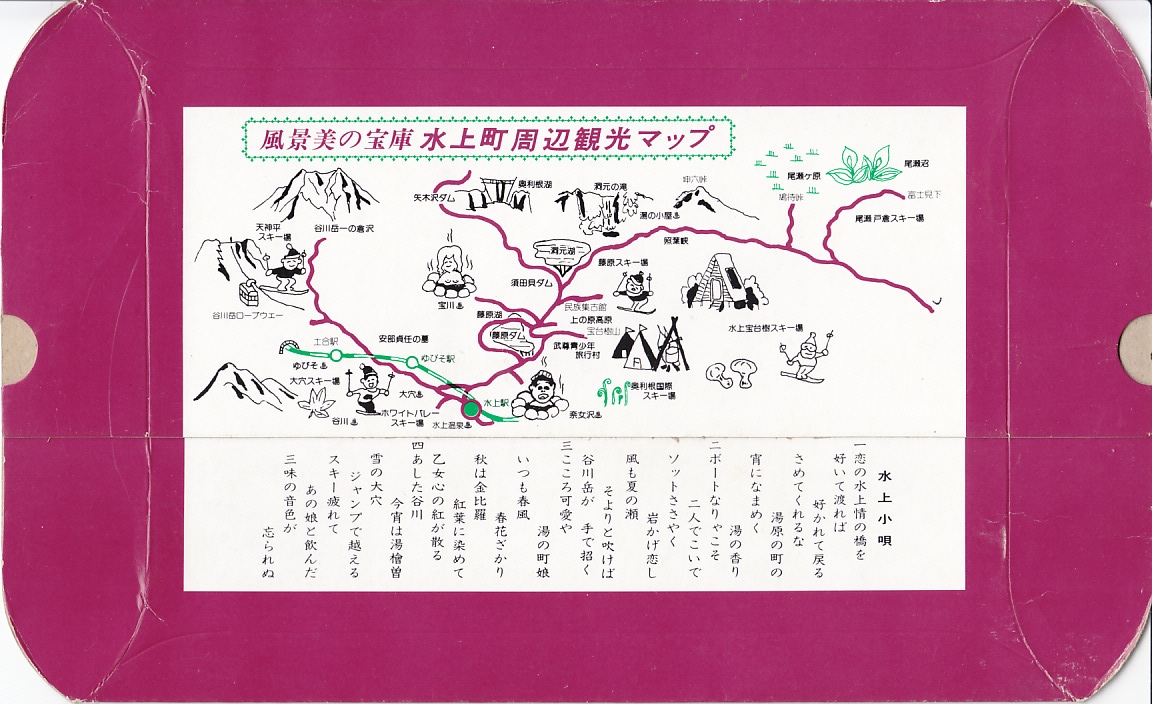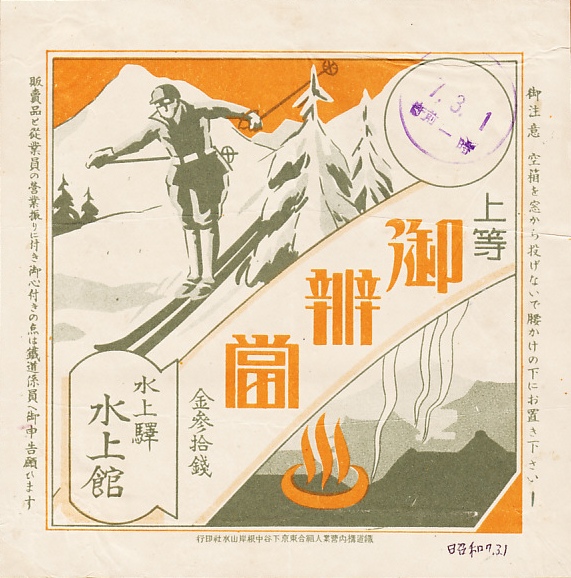 1932(昭和7)年3月1日1時の調製と思われる、昔の水上駅弁の掛紙。掛紙に描かれるスキーと温泉は、昭和時代も21世紀も水上の観光資源である。調製元の水上館とは、水上駅の開業から数年間だけ構内営業を実施したという水上温泉株式会社のことか。