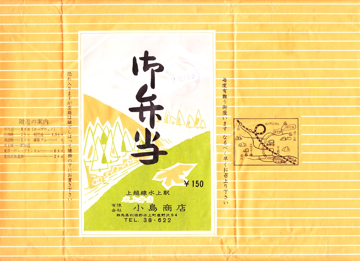 1963(昭和38)年2月21日13時の調製と思われる、昔の水上駅弁の掛紙。なんとなく山の中の絵柄で、右側面に名所の絵図を、左側面に名所の文字を入れた。昔は学校の教科書に載ったという、上越線のループ線。