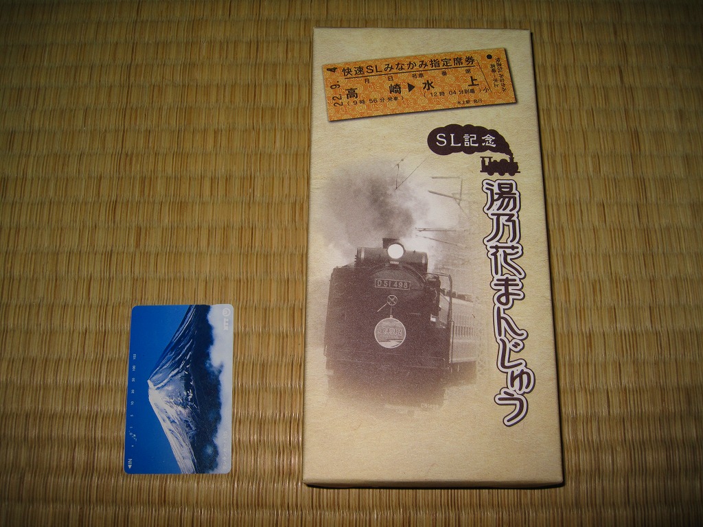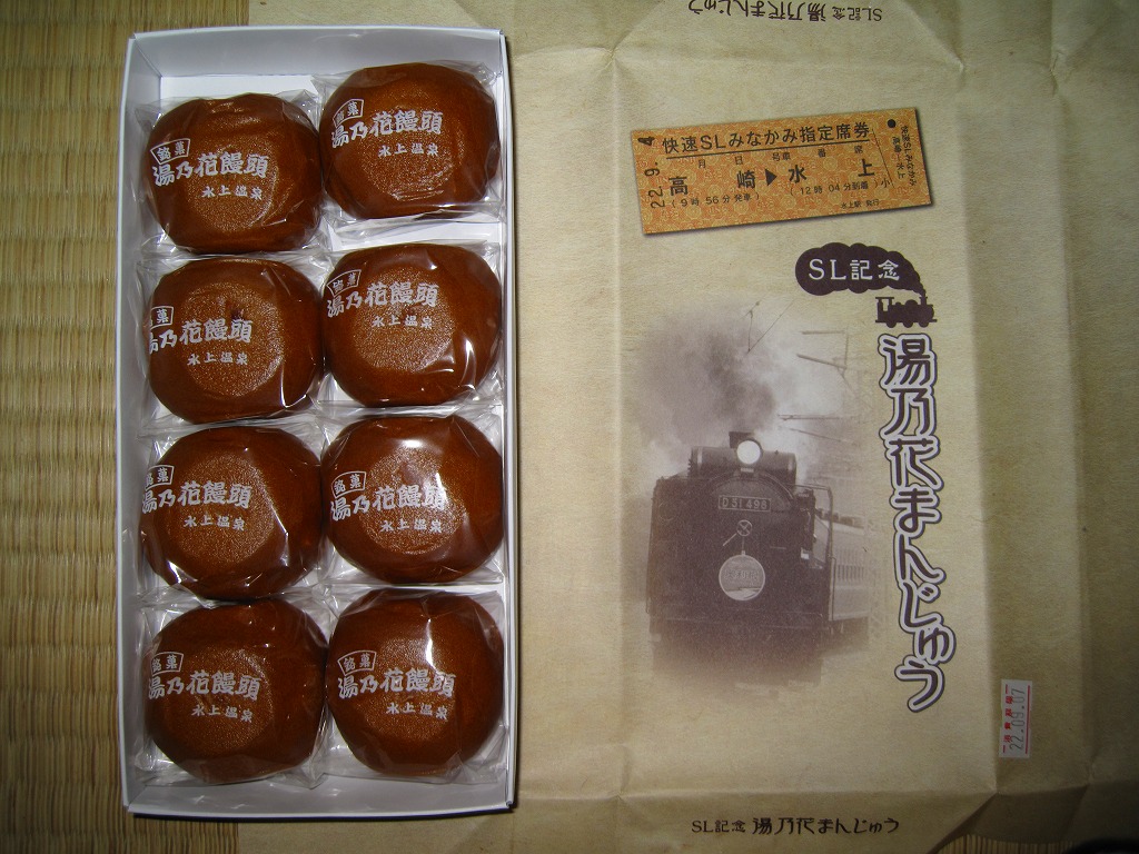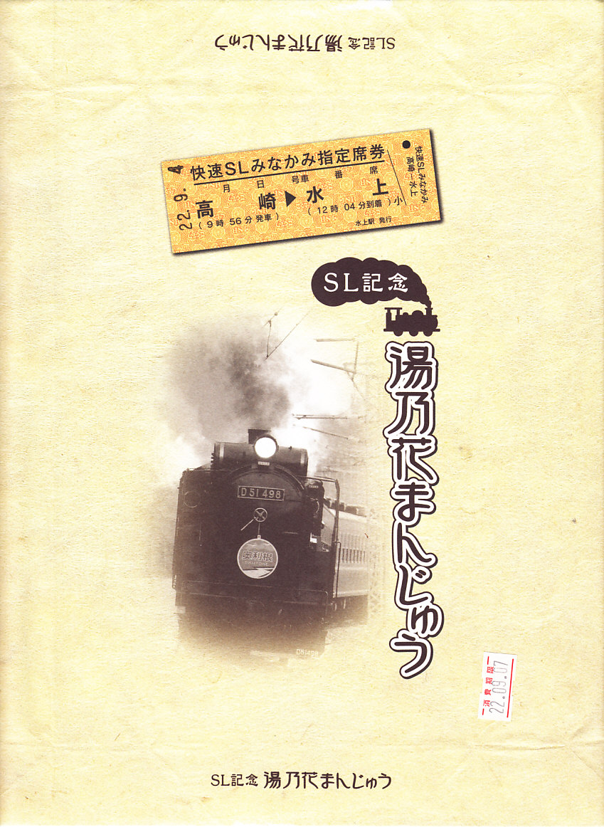 これは駅弁ではなく、鉄道にちなんだ土産物。北海道産の小豆、沖縄産の黒糖と群馬県産の赤糖を使ったという饅頭が8個で680円。包装紙は上越線を運行するSL列車にちなんでおり、写真は実際に使われる蒸気機関車、きっぷのイメージに記される列車名と区間と時刻は実際のもの、さらに購入日の日付が定位置に押されていた。地元で観光列車が大切にされていることが、これで分かるもの。駅弁がないことがつくづく惜しい。