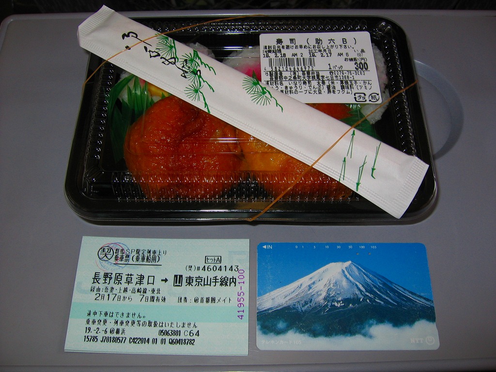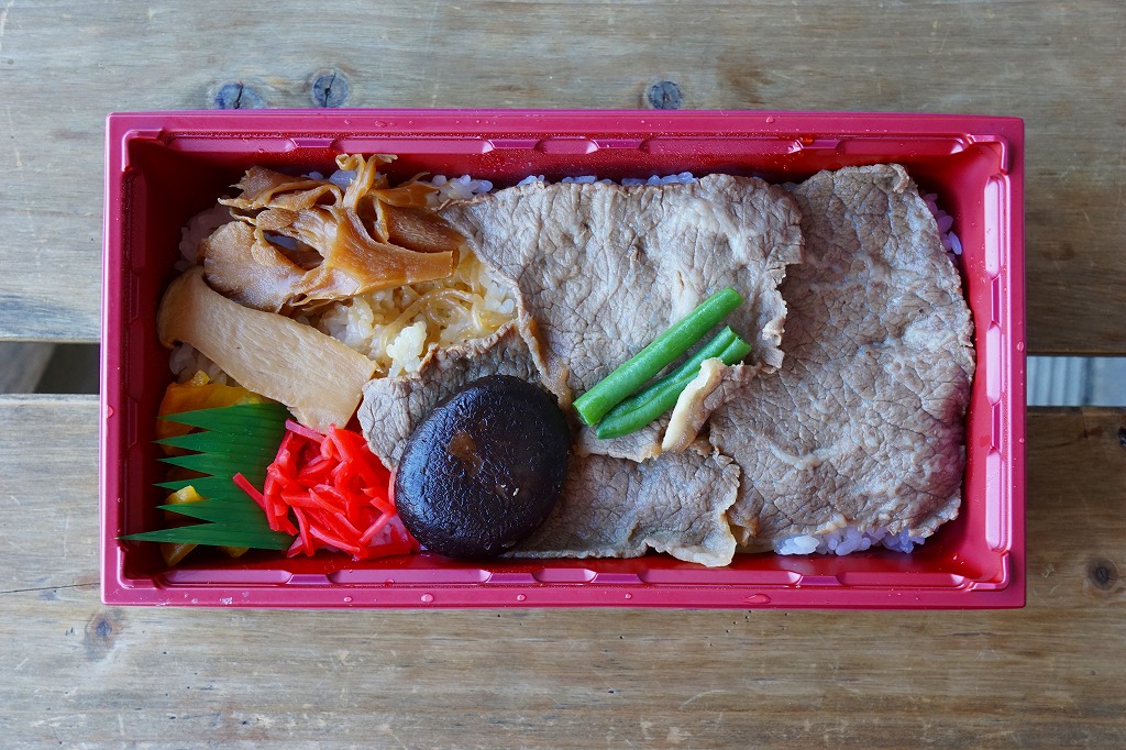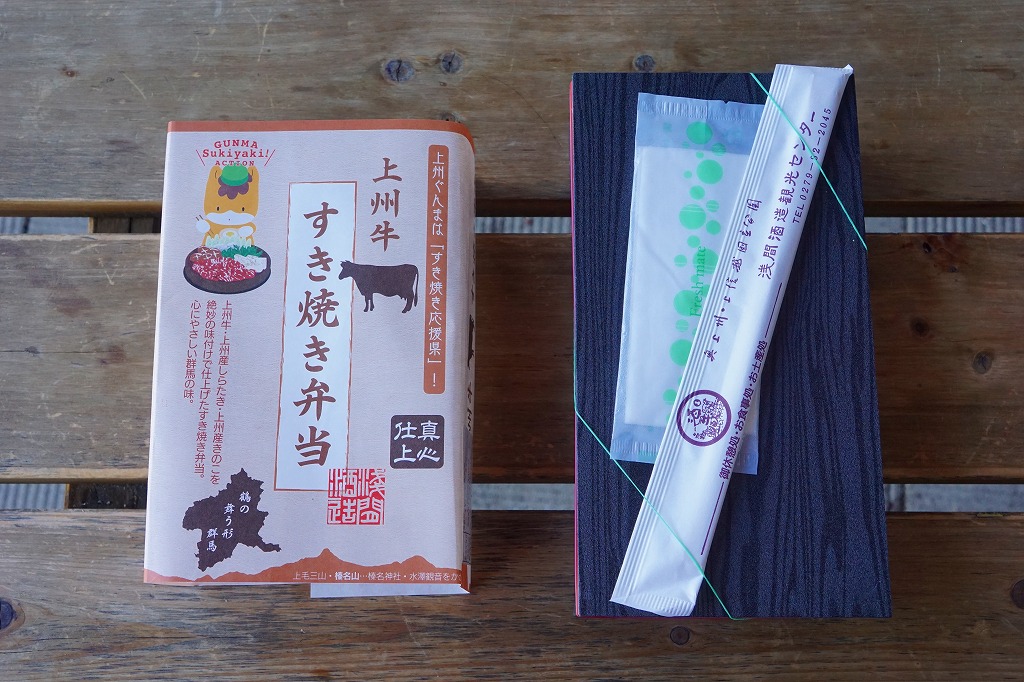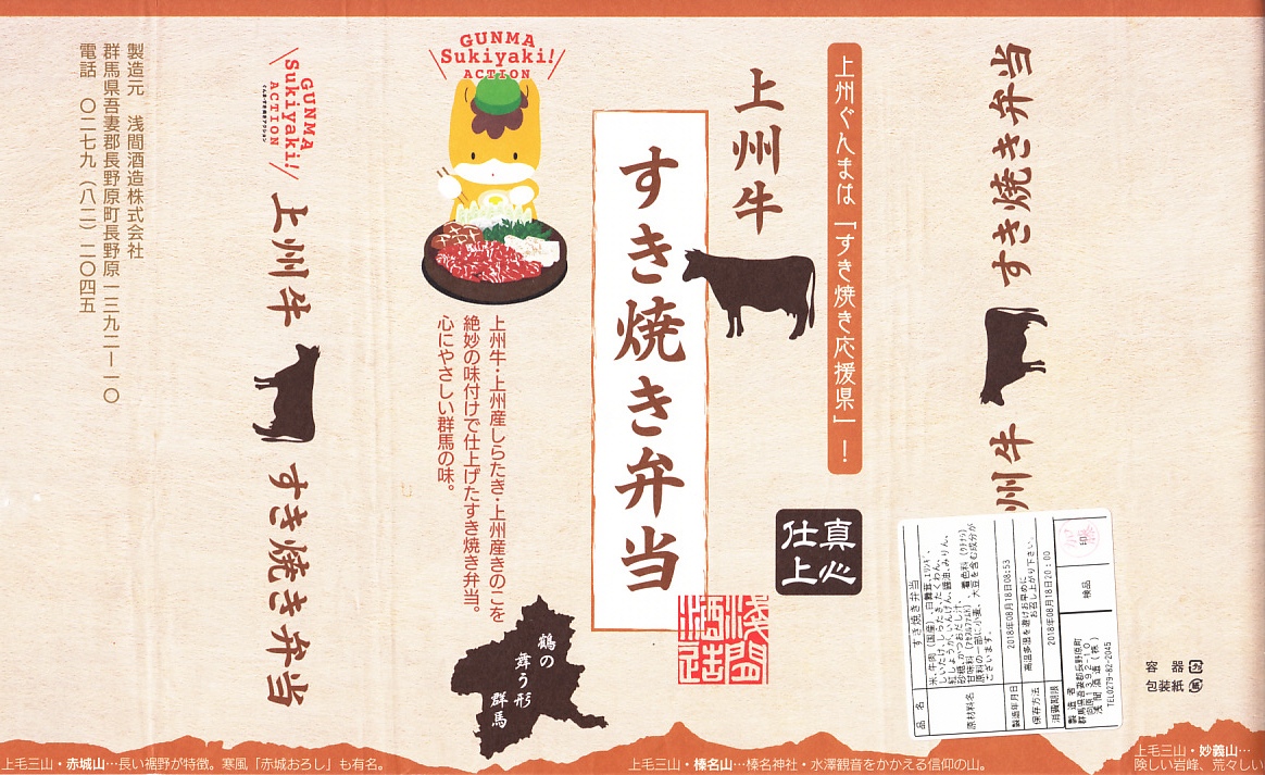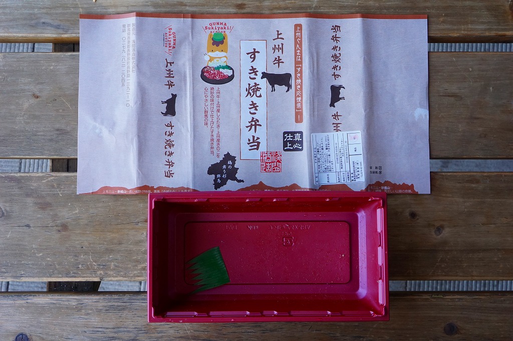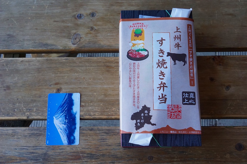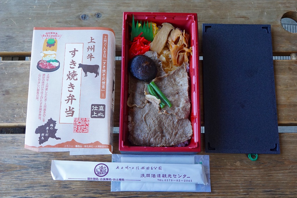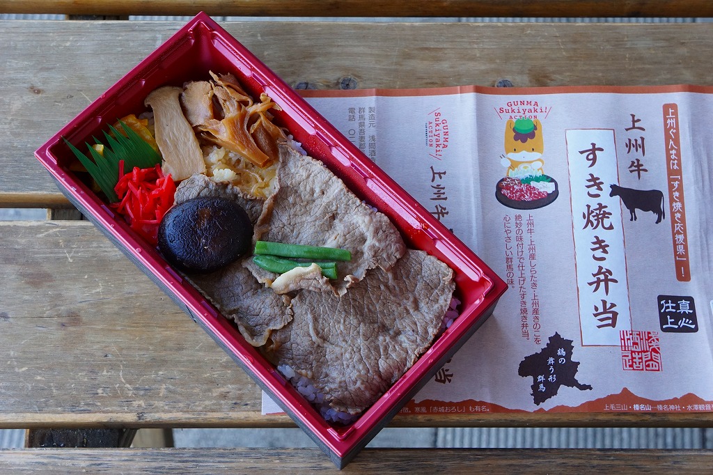 2015(平成27)年の秋までに、長野原草津口駅の売店や長野原町内のドライブインで発売か。白飯を牛肉煮で覆い、しいたけ、いんげん、エリンギ、糸こんにゃく、紅生姜、たくわんを添える、商品名どおりのすき焼き弁当。上州牛の薄い牛肉煮にタレもその添付もなく、淡泊に過ぎる上質な風味を楽しむ。駅売店の撤去後は、駅の隣の公共施設「長野原・草津・六合 ステーション」でも販売。