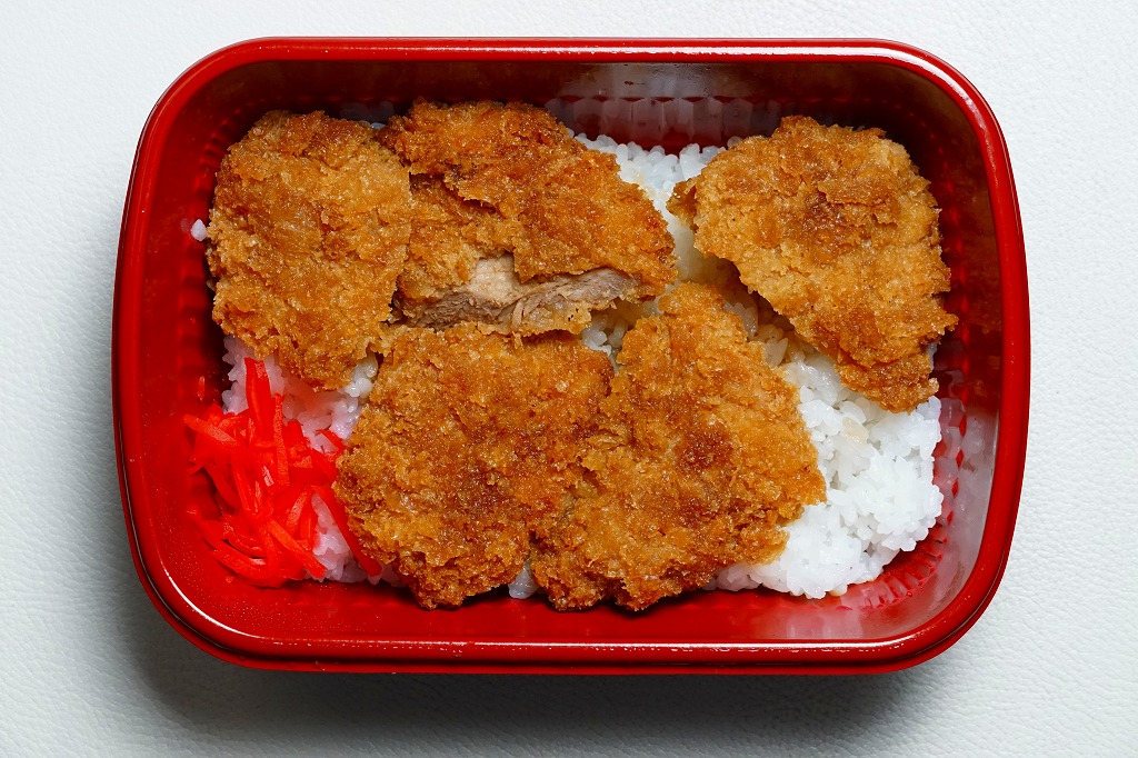 2022(令和4)年までに、長野原草津口駅の隣の店舗などで発売か。群馬の名所名産をいろいろアイコンにしたとみえる、オレンジ色の掛紙を巻くホカ弁向けプラ容器に白飯を詰め、ソースカツで覆い、紅生姜を添える。調味料と付合せ以外はほぼ飯と肉だけの、シンプルな内容。薄味で手作り感のあるトンカツにより、この中身でも軽い味がしたと感じた。今回2025年の訪問時で、長野原草津口駅の隣の公共施設「長野原・草津・六合ステーション」では、これと「上州牛すき焼き弁当」(1,800円)と「カツサンド」(900円)が売られていた。