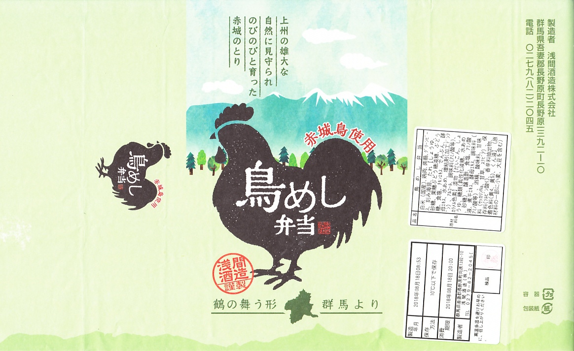 2016(平成28)年の秋までに長野原町内のドライブインで発売か。白飯を鳥むね肉と鳥そぼろで覆い、グリーピースで彩り、こんにゃくと漬物を添える。赤城の鶏と山を描く掛紙も付き、見た目は立派な駅弁で、淡泊に過ぎる風味は駅弁にない感じ。調製元は長野原で駐車場付き観光売店を営む酒造業者で、駅売店の撤去後は駅の隣の公共施設「長野原・草津・六合 ステーション」でも販売。