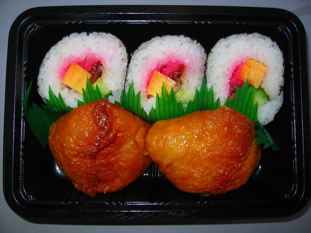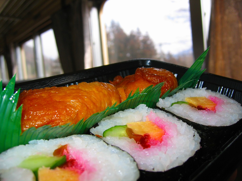 公式な駅弁がもともとなく、非公式駅弁も消えた長野原草津口駅で買えた助六寿司。写真のとおり、ただの惣菜。コンビニではなくキヨスクで販売されていたので、ほんの少しだけ駅弁らしくはあるが、まあ駅弁とは見なせない。正四面体型のおいなりさんがかわいらしい。JRバスが発着するホームにはコンビニ型売店があり、そこでは「O−bento」を販売していた。今は駅にキヨスクがなく、この商品も消えた模様。