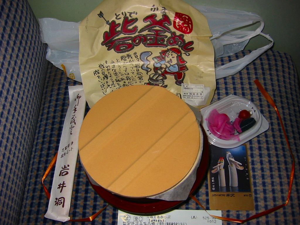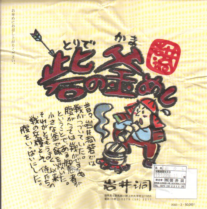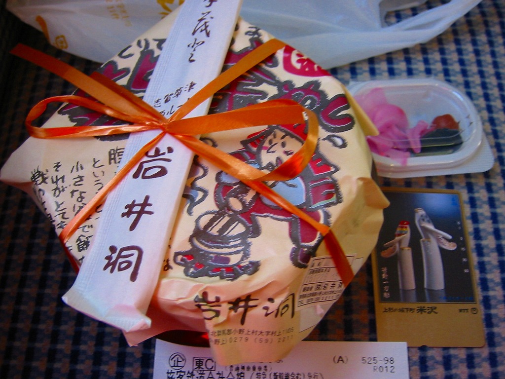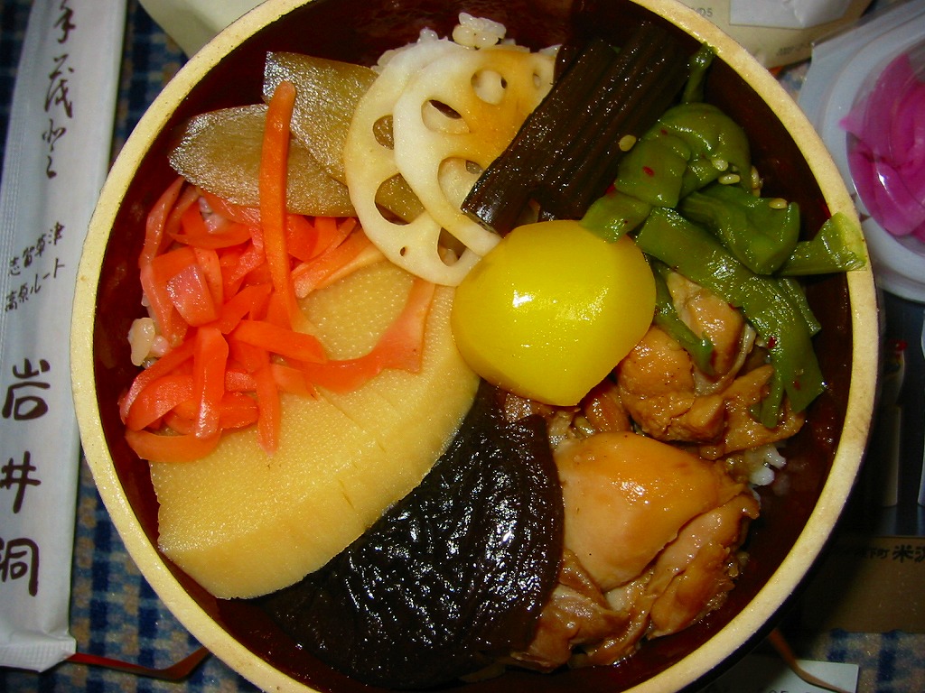 草津温泉の玄関口である、JR吾妻線の長野原草津口駅で販売されていた、知られざる非公式駅弁。ふたも本体も陶製の釜型容器を使用、他の多くの釜飯駅弁と同様、長方形の掛紙をかけて割りばしごとビニールひもでしばる。中身も正に釜飯駅弁で、茶飯の上に鶏肉と大きな椎茸やタケノコに栗やゴボウや山クラゲなどを載せる。上野から毎日4本以上の特急が乗り入れるのに、なぜか公式な駅弁が存在したことのない長野原駅(1991年から長野原草津口駅)で、駅弁として立派にその役割を果たしていたと思う。