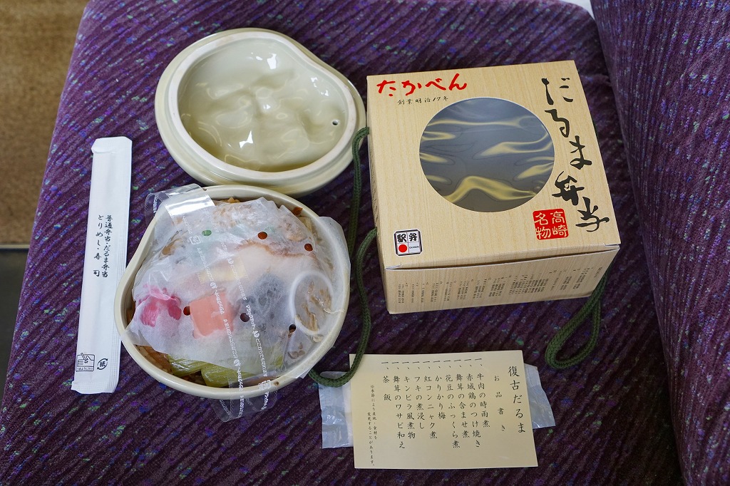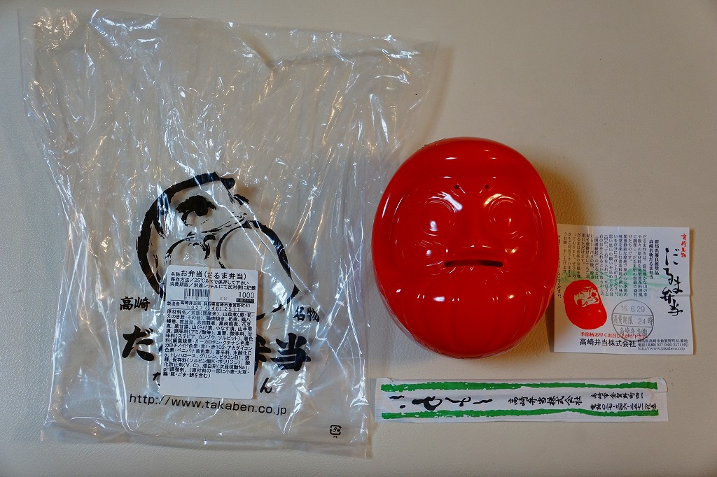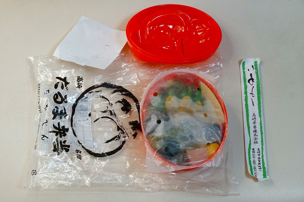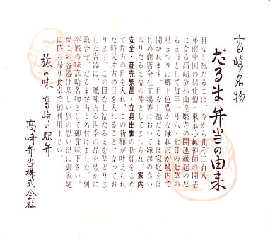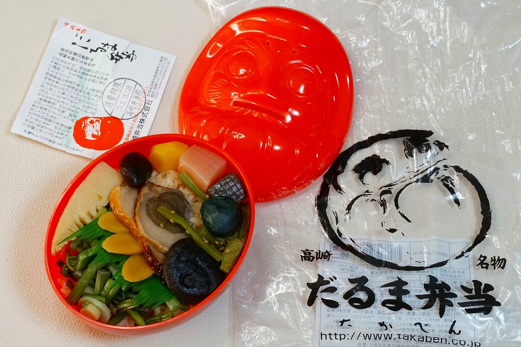 1960(昭和35)年に高崎駅で発売。高崎と日本を代表する、有名な駅弁。駅弁の名前は、だるまで有名な高崎市内の少林山達磨寺にちなむ。ダルマ型の真っ赤なプラ容器を使用、中身は群馬の山の幸ということで、茶飯の上をコールドチキン、鶏八幡巻、赤と黒のこんにゃく玉、シイタケ、タケノコ、山菜きのこ煮、山ごぼう漬、山くらげで覆い、小ナス漬と栗と花豆煮を添えるもの。価格は長らく900円であったが、2014年3月に1,000円へ値上げ、2019年2月1日から1,080円、2020年時点で1,100円、2023年4月から1,300円、2024年10月から1,400円。