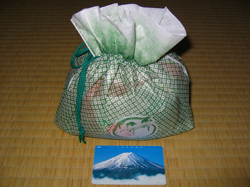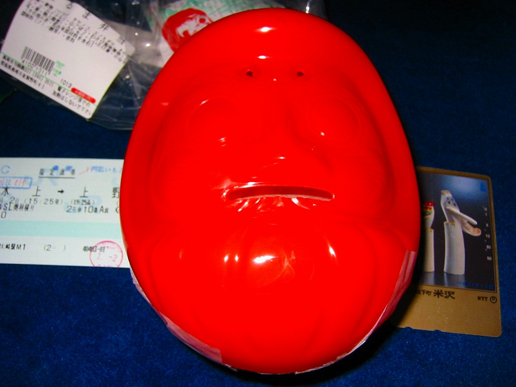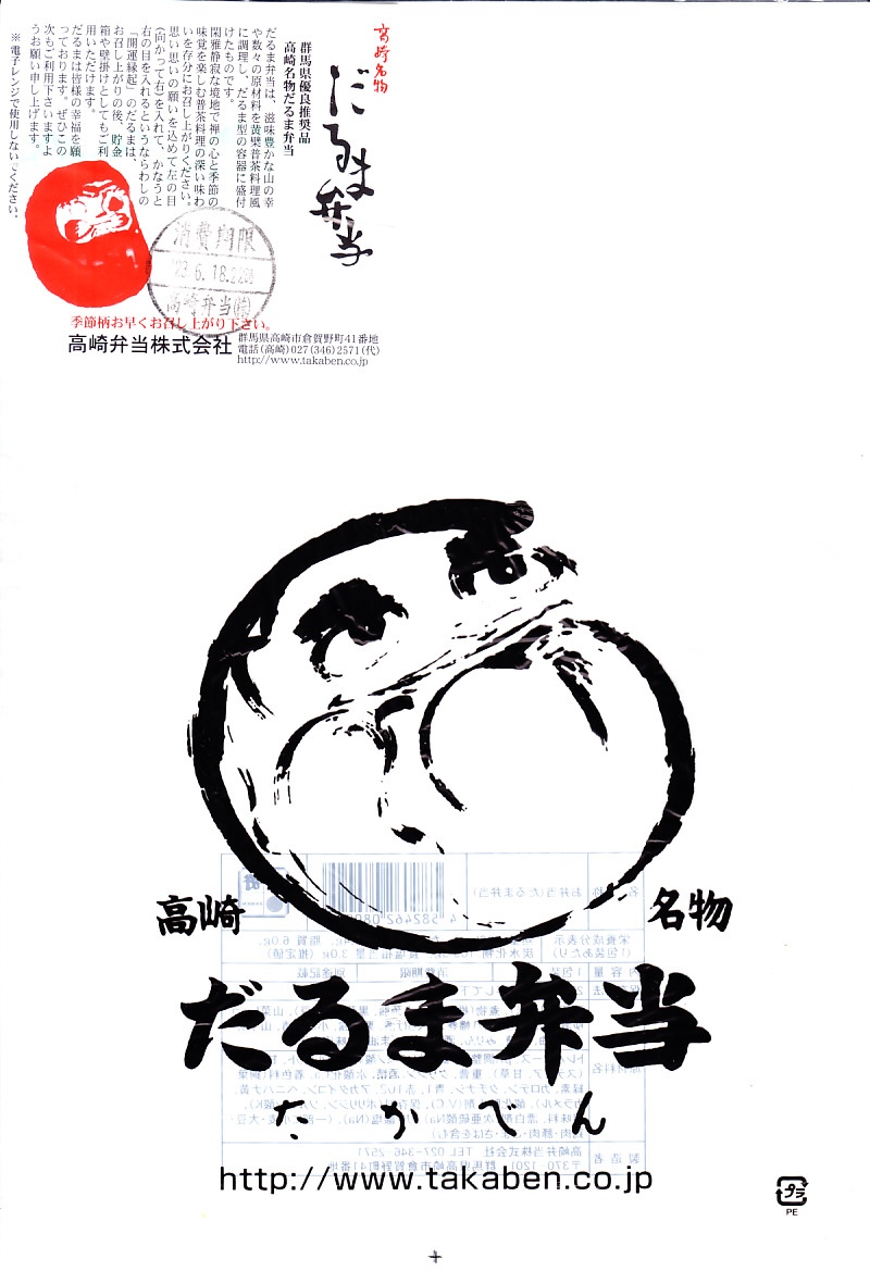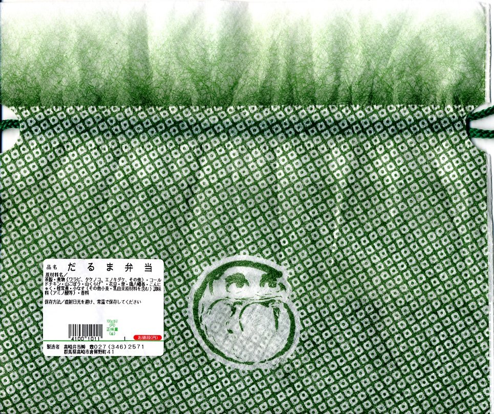 高崎駅でもスーパーやデパートの駅弁大会でもおなじみの、高崎名物だるま弁当。2006(平成18)年1月の西武百貨店池袋店での催事でも、だるま弁当・とりめし・はろうきてぃのだるま弁当の定番3種が実演販売されていたが、だるま弁当が見慣れない専用のきんちゃく袋に入っていたので買ってみた。これ以降、この袋には出会えていない。価格は2006年の購入時で、通常版と同じ900円。現存すれば、通常版と同じ1,400円で売られるのではないかと思う。