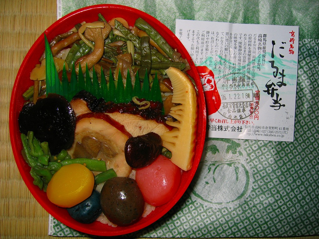 中身は茶飯を、牛肉の時雨煮、赤城鶏のつけ焼き、舞茸の含ませ煮、花豆のふっくら煮、かりかり梅、紅コンニャク煮、フキの煮浸し、キンピラ風煮物、舞茸のワサビ和えで覆うもの。地元群馬の産品を多用したコンセプトも、しっかり復刻。中身に鶏肉も牛肉も入っては、現行版のヘルシーさはないが、戦後の駅弁はむしろ高カロリーが求められていたため、その点でも実は復古調か。見栄えで驚かせ、風味は良好。価格は2017年の購入時で1,500円、2019年2月1日から1,650円。2019年10月に販売を休止、そのままなくなってしまった模様。