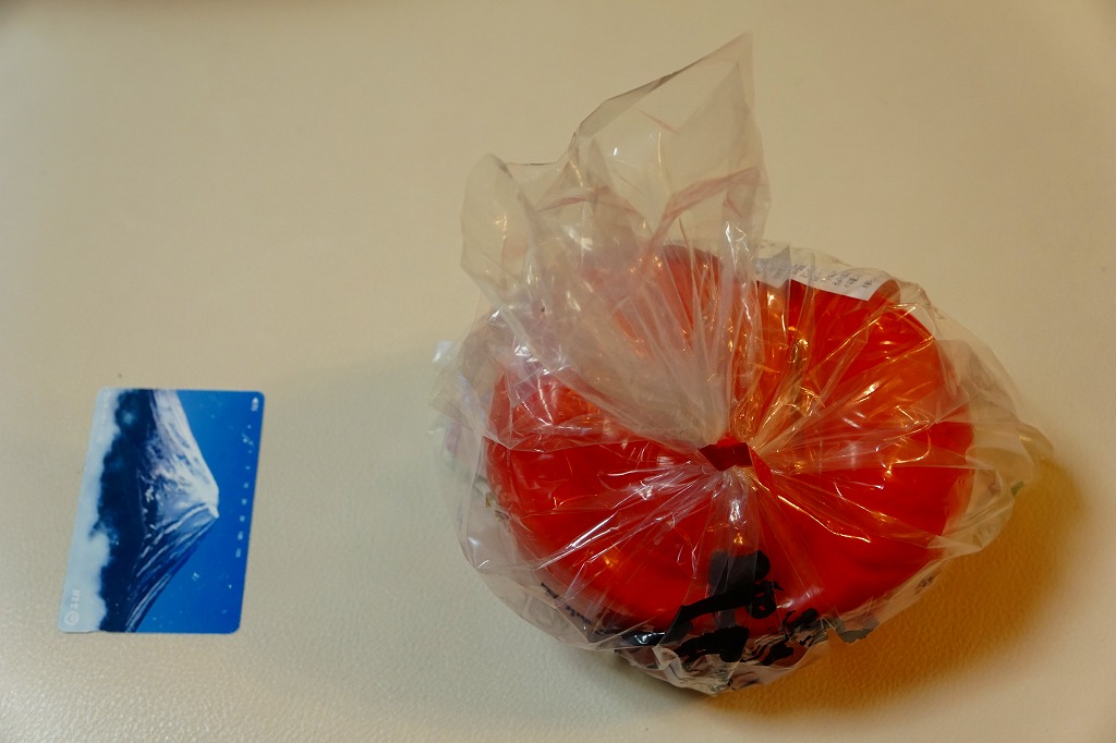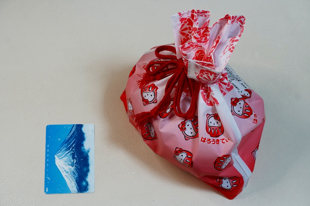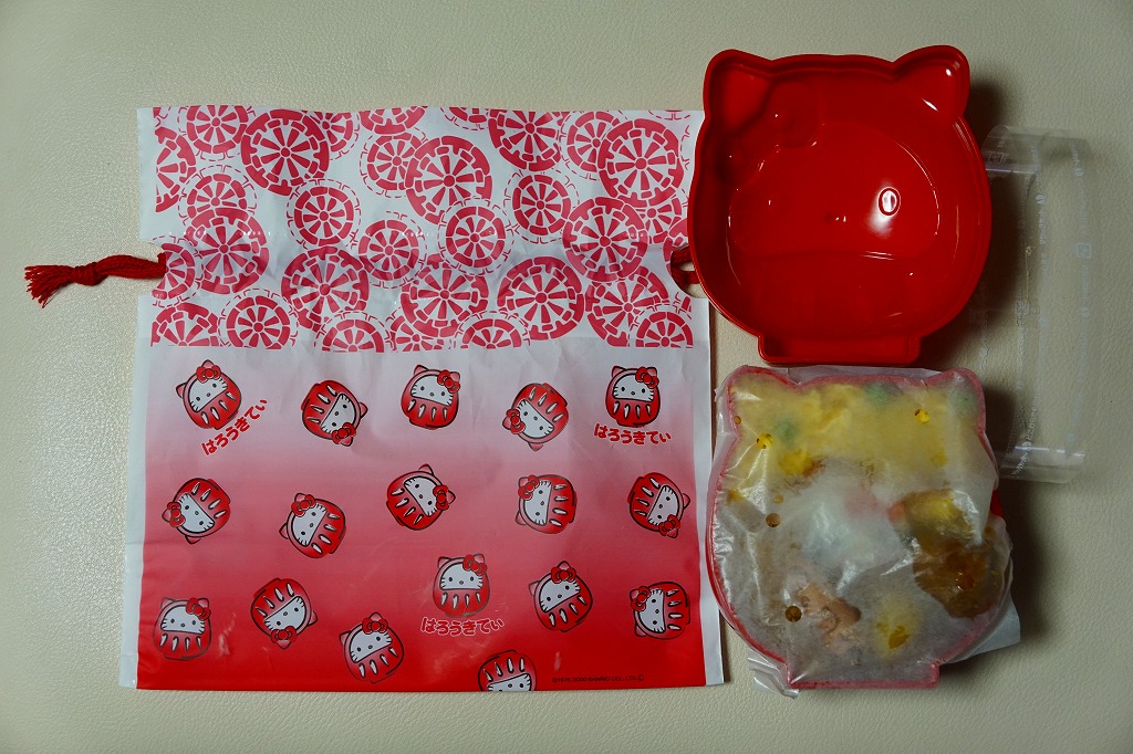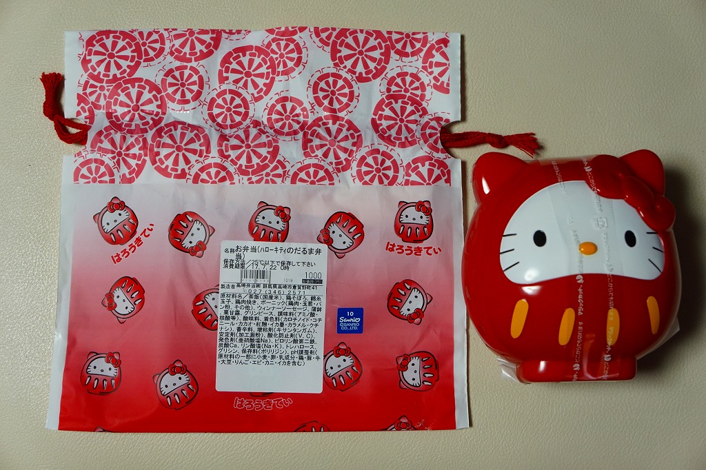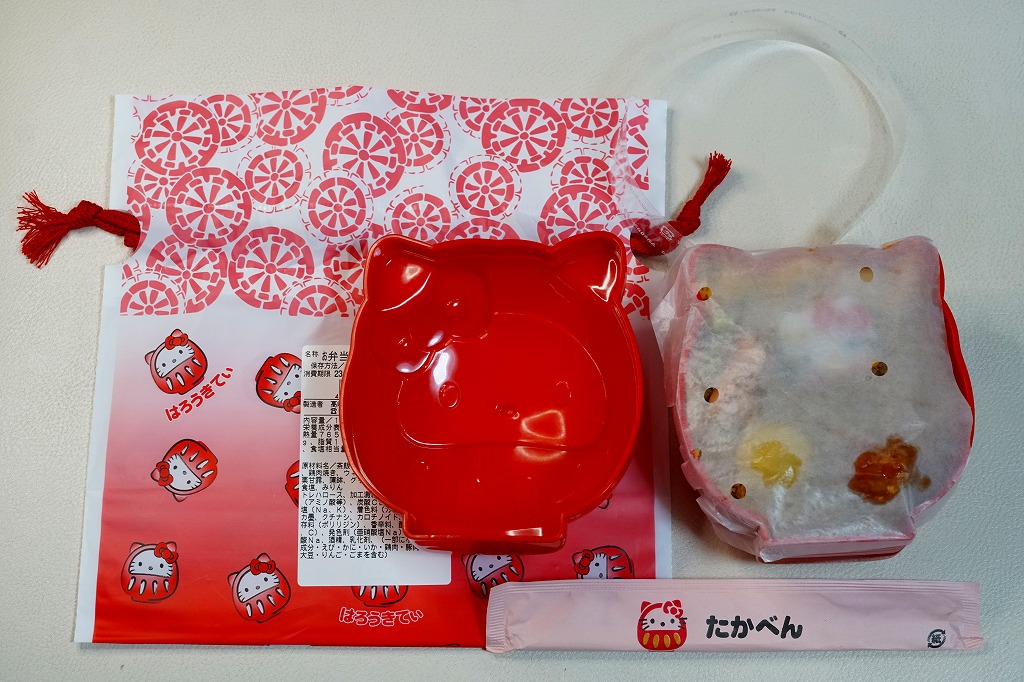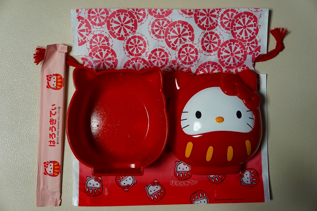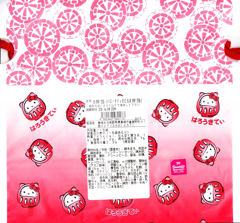 2001(平成13)年11月22日に購入した、高崎駅弁の袋。上記の駅弁「ハローキティのだるま弁当」と、袋や容器やキャラクターは変わらない。中身もほぼ同じであるが、鶏そぼろと錦糸卵の配置が異なったり、当時は山菜とキティ型こんにゃくが入っていたことがわかる。