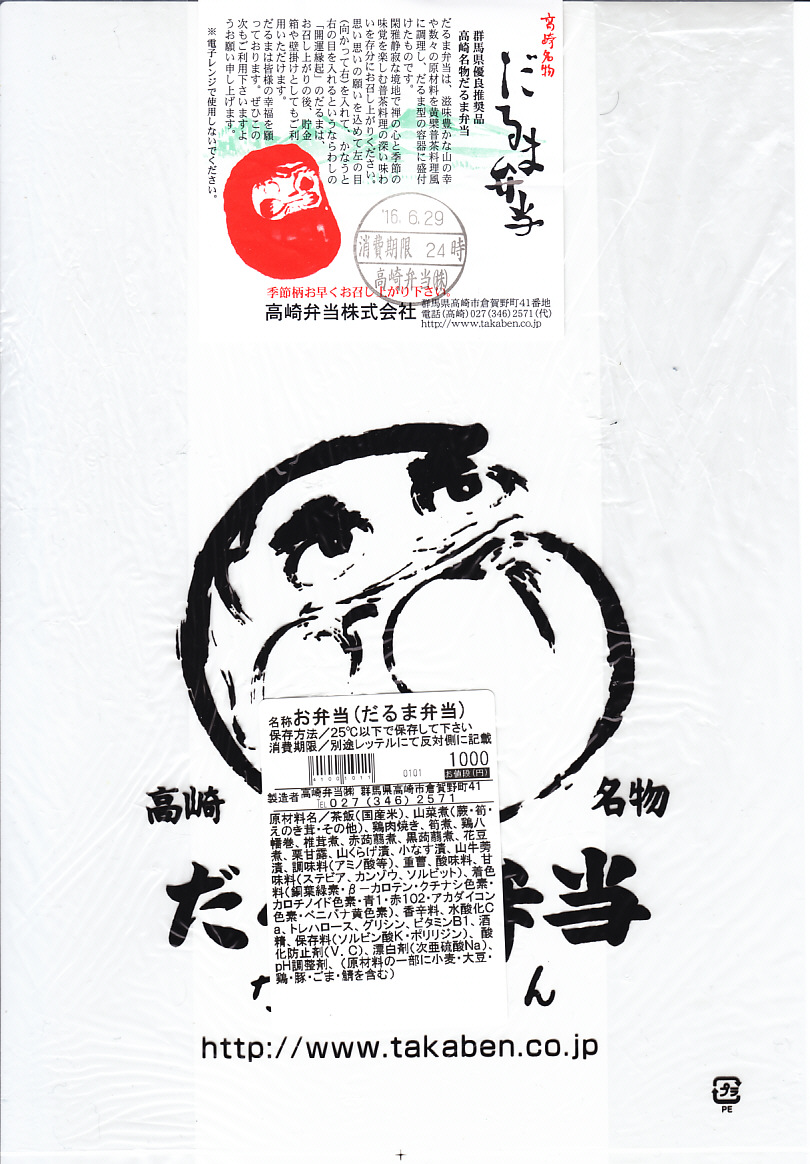 2016(平成28)年6月29日に購入した、高崎駅弁の袋。上記の2023年のものと変わらない。食品表示ラベルのレイアウトと記載事項は異なる。