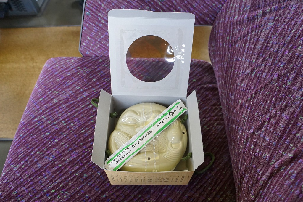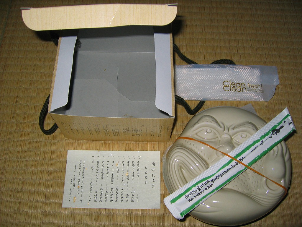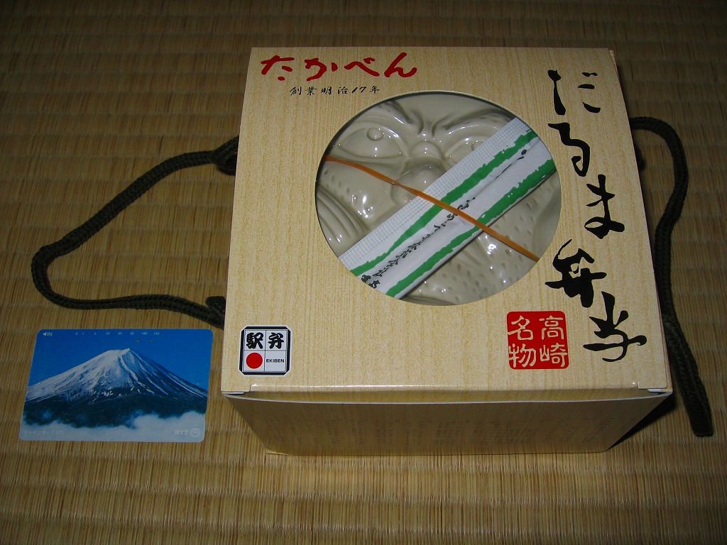 高崎の名物駅弁「だるま弁当」の復刻版で、2006(平成18)年5月1日から毎日30個を併売。34年前の1972(昭和47)年当時の「だるま弁当」の姿を復刻したという、達磨大師の顔を不気味に浮き出した陶器は、当時も今も子供が泣き出しそう。これに割りばしを添え、輪ゴムで留め、持ち運び用ひも付きの頑丈な紙箱に詰める。