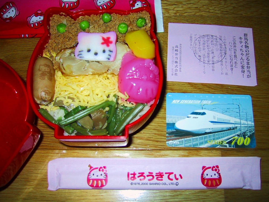 2000(平成12)年11月15日に高崎駅で発売。高崎駅の名物駅弁「だるま弁当」の容器と袋が、サンリオの人気キャラクター「ハローキティ」になった。このかわいらしいプラ容器に茶飯を詰め、鶏そぼろと錦糸卵で覆い、肉団子、鶏照焼、くり、キティちゃん柄のウインナーとかまぼこを載せる。そんな中身は同じく高崎駅で伝統の駅弁「とりめし」に近い。ハローキティの駅弁は、1997年の岡山駅弁やこの高崎駅弁が出た頃には、札幌駅から小倉駅まで各地に普及したが、現存するうえ20年変わらないのは、この高崎駅弁だけ。価格は2000年の発売時で900円、2014年3月から1,000円、2019年2月から1,080円、2020年時点で1,100円、2022年時点で1,300円、2023年4月から1,380円、2024年10月から1,450円。