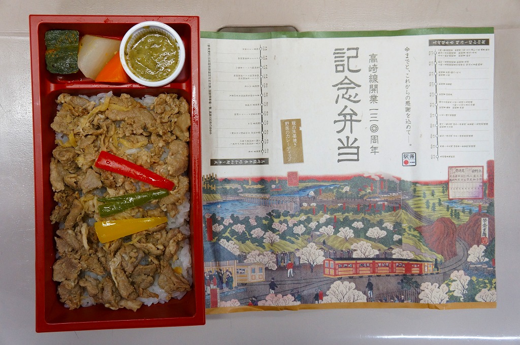 駅弁の名称のとおり、高崎線の開業130周年を記念して、おそらく2013(平成25)年7月1日から9月30日まで発売。JR東日本の「高崎線130周年キャンペーン」の一環でもあるだろう。白御飯を豚肉の生姜焼きで覆い、3色のピーマンやパプリカで彩り、ダイコンとカボチャとニンジンと、「野菜のカレーディップ」なるバター味なグリーンカレーソースを添える。