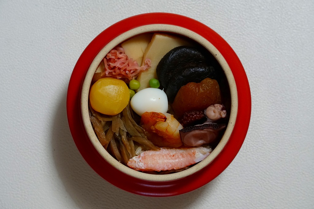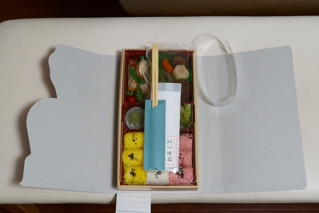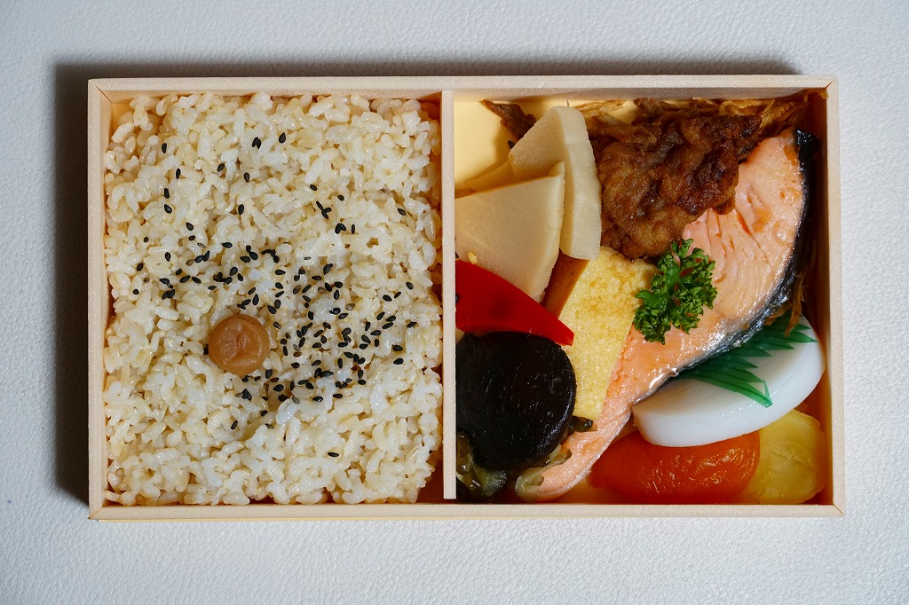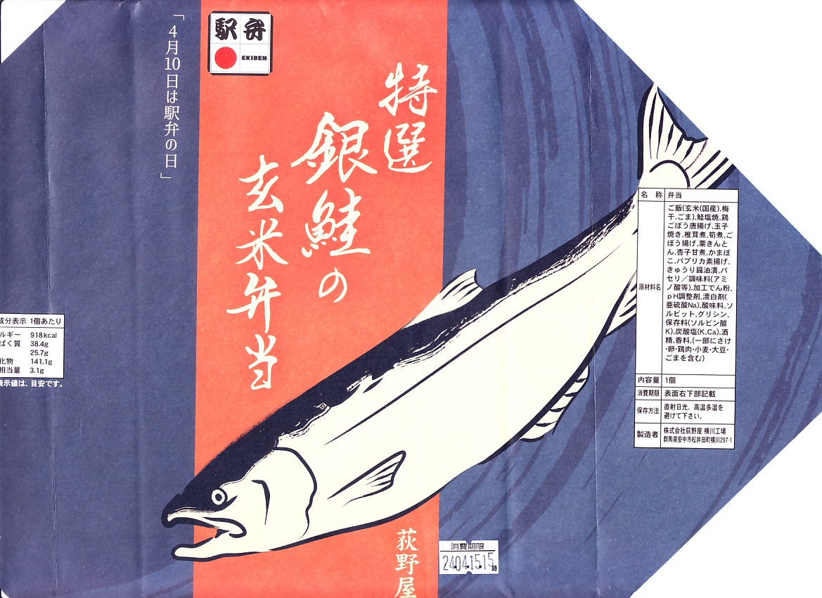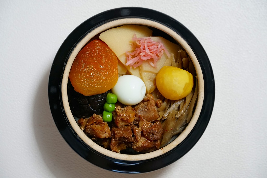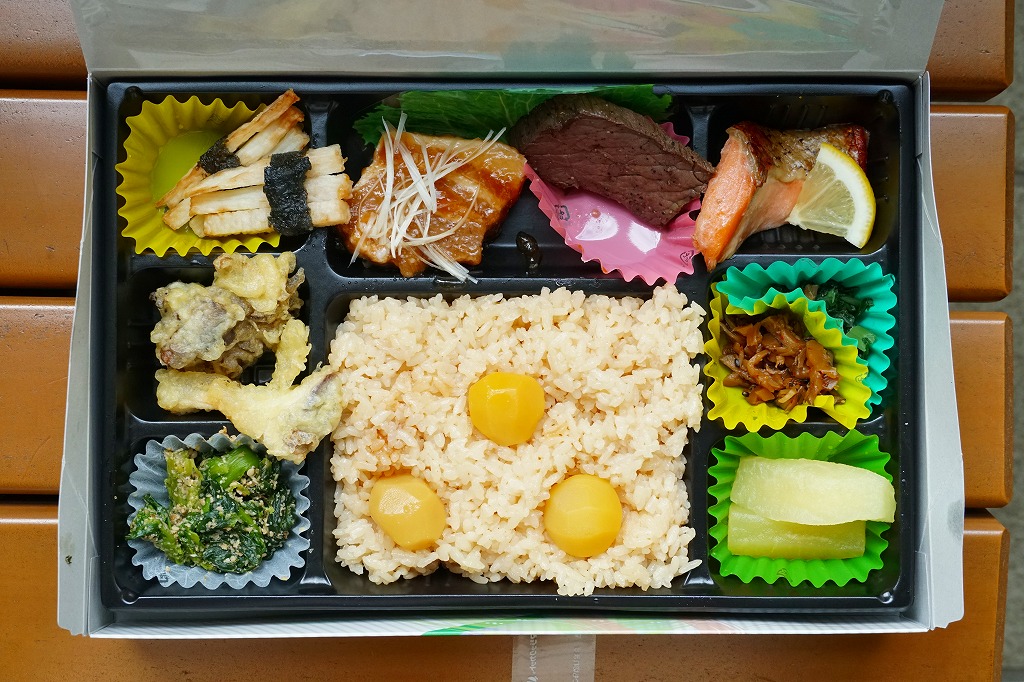 玄米混じりでなく玄米そのものの日の丸御飯に、鮭塩焼、鶏ごぼう唐揚げ、玉子焼、しいたけ、たけのこ、パプリカ、ごぼう、かまぼこ、あんず、栗きんとん、きゅうり漬け。令和の新作なのに、見た目は昭和あるいは戦前に遡れるかもしれない、古風なつくりにみえる。1974年生まれの横川駅弁「玄米弁当」の、おかずを充実させた感じ。荻野屋の期間限定の高崎駅弁なので、もう二度と売られないのではないかと思うが、古風な駅弁か老舗の仕出し弁当のような肩書きで、経木折に詰めて残したいレシピだと思った。