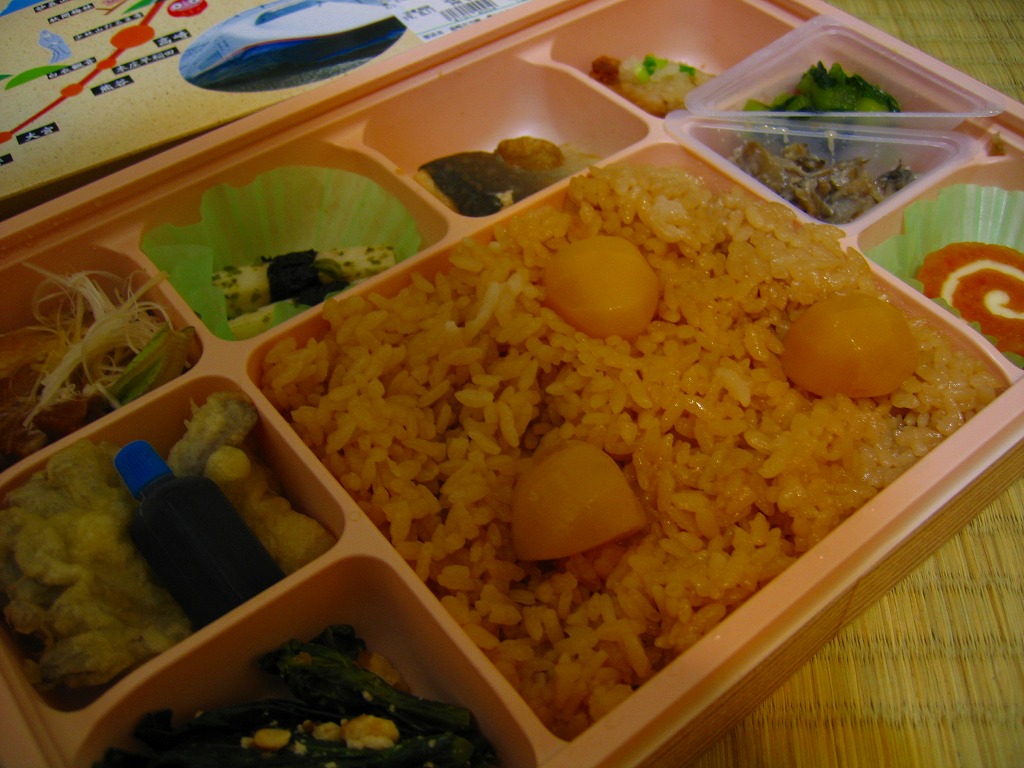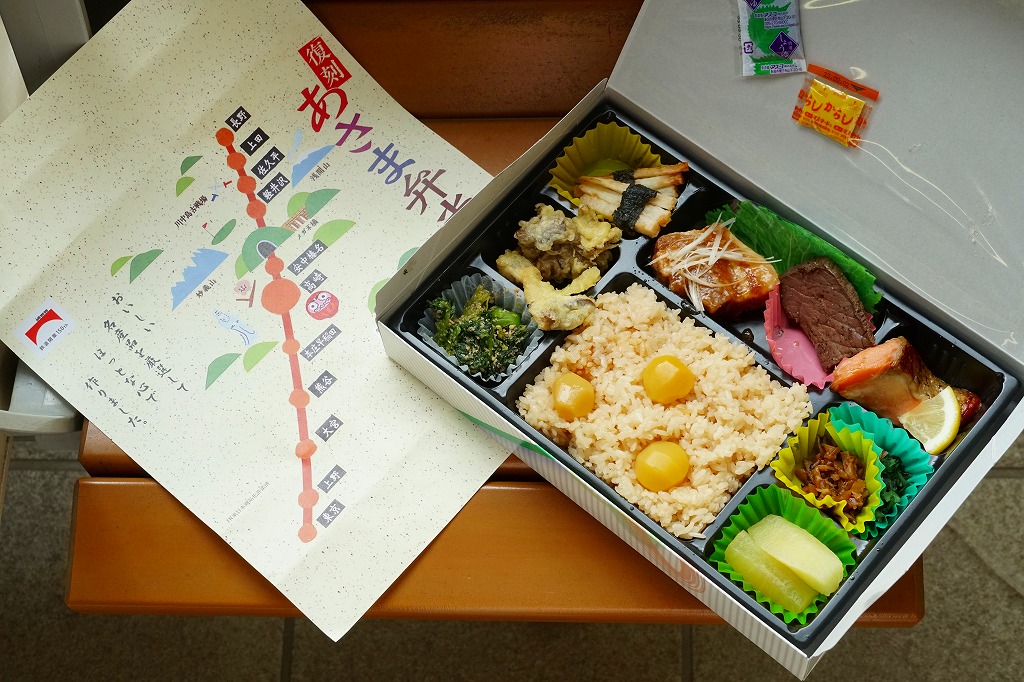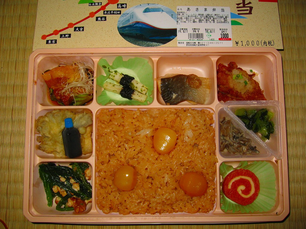 「あさま弁当」という名前の駅弁は過去にも存在したが、今回は長野新幹線開業10周年の記念駅弁か。東京〜長野間の簡単すぎる路線図を描いたボール紙の枠に、プラ製のふたが透明な惣菜容器をはめる。中身は栗御飯の周りを豚角煮、舞茸天、クルミと菜の花の和え物、長芋磯辺揚、イワナ塩焼、鯉竜田揚、アンズなると巻など、独特のおかずで囲むもの。お品書きも備わり、山の幸を体感できる。