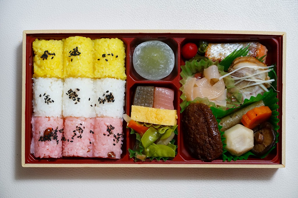 復刻なので、容器や中身は当時のものとそっくり。高崎観音を大きく描いた長い容器に、「勇気(白飯)、やる気(ウコン飯)、元気(赤飯)の3色ご飯」、榛名豚チャーシュー白髪ねぎ添え、群馬県産舞茸入り肉団子、上州の清流育ちシルクサーモン照焼き、パスタ風こんにゃく、レンコンきんぴらのきぬさや添え、煮物、厚焼き玉子と角こんにゃく煮、コンニャク抹茶もちを詰める。おしながきはふたに直接印刷し、おみくじの添付は以前と同じ。ちょっと毒々しい御飯の色が印象に残る、おかずたっぷり幕の内。