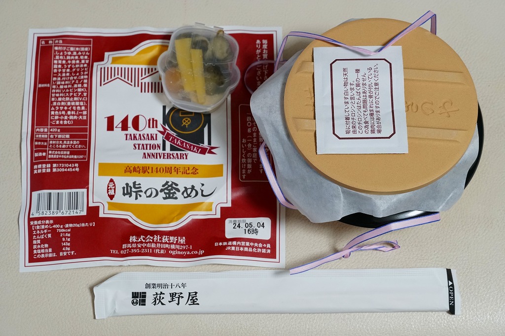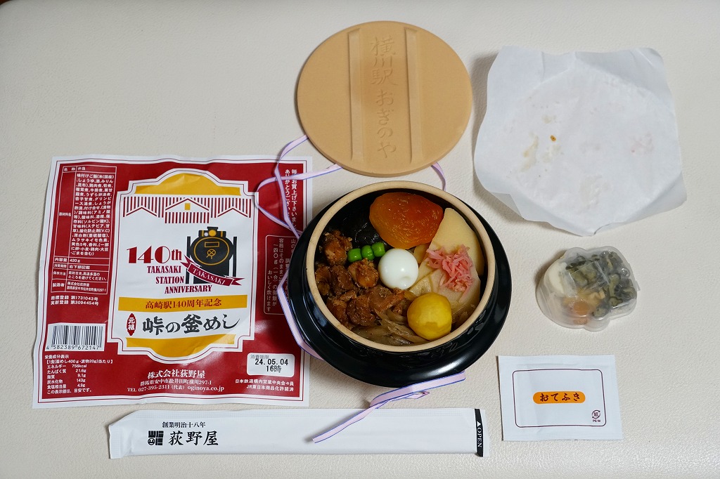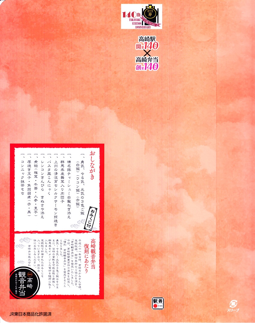 2024(令和6)年4月27日から5月6日まで、高崎駅のコンビニ「ニューデイズ」と土産物店「HANAGATAYA」計6店舗で販売。高崎駅の開業140周年を記念して、2009年から2010年まで売られたかつての高崎駅弁「高崎観音弁当」を復刻したものと、荻野屋の「峠の釜めし」の限定掛け紙版が販売された。