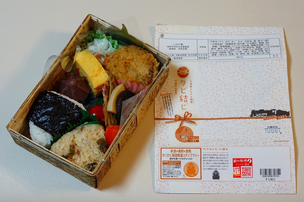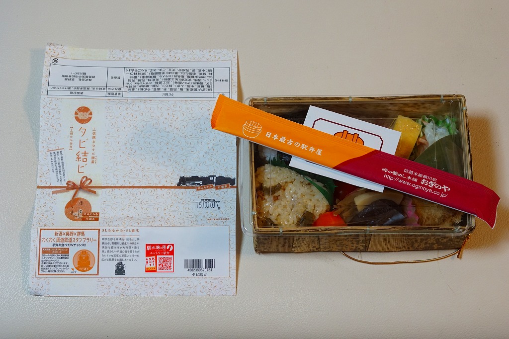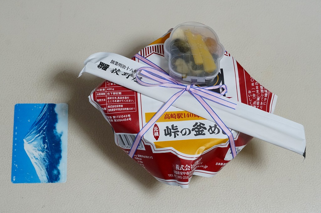 2024(令和6)年4月1日から21日まで、高崎駅や東京駅と、群馬県や長野県の「おぎのや」店舗で販売。駅弁の日に合わせ、日本鉄道構内営業中央会の会員のうち31社が各社おすすめ駅弁に共通ノベルティ「千社札風カード」を添付して期間限定で販売した駅弁の、高崎駅バージョン。販売期間は5月6日まで延長されたという。