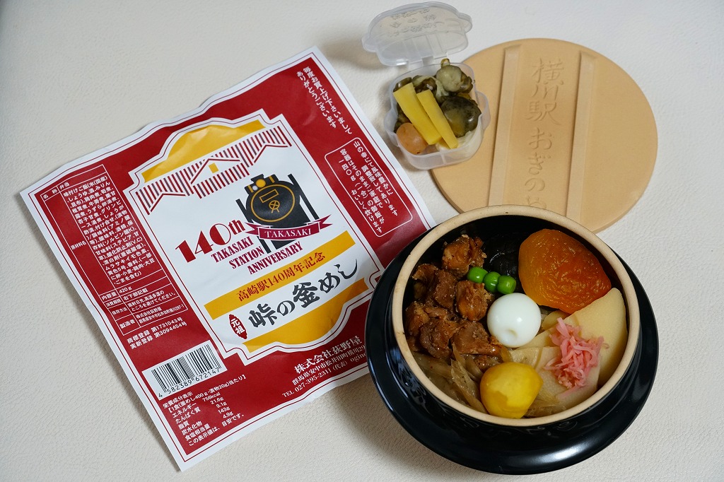2024(令和6)年4月27日から5月6日まで、高崎駅のコンビニ「ニューデイズ」と土産物店「HANAGATAYA」計5店舗で販売。高崎駅の開業140周年を記念して、限定掛け紙をつけた荻野屋の「峠の釜めし」と、高崎弁当の「高崎観音弁当」の復刻版が販売された。掛紙は駅弁の現物で使用するものとは別に、これと同じ未使用品をもらえた。普段は茶色い釜飯型陶器は、ここでは黒くなった。中身は通常版と同じで、価格は200円高かった。